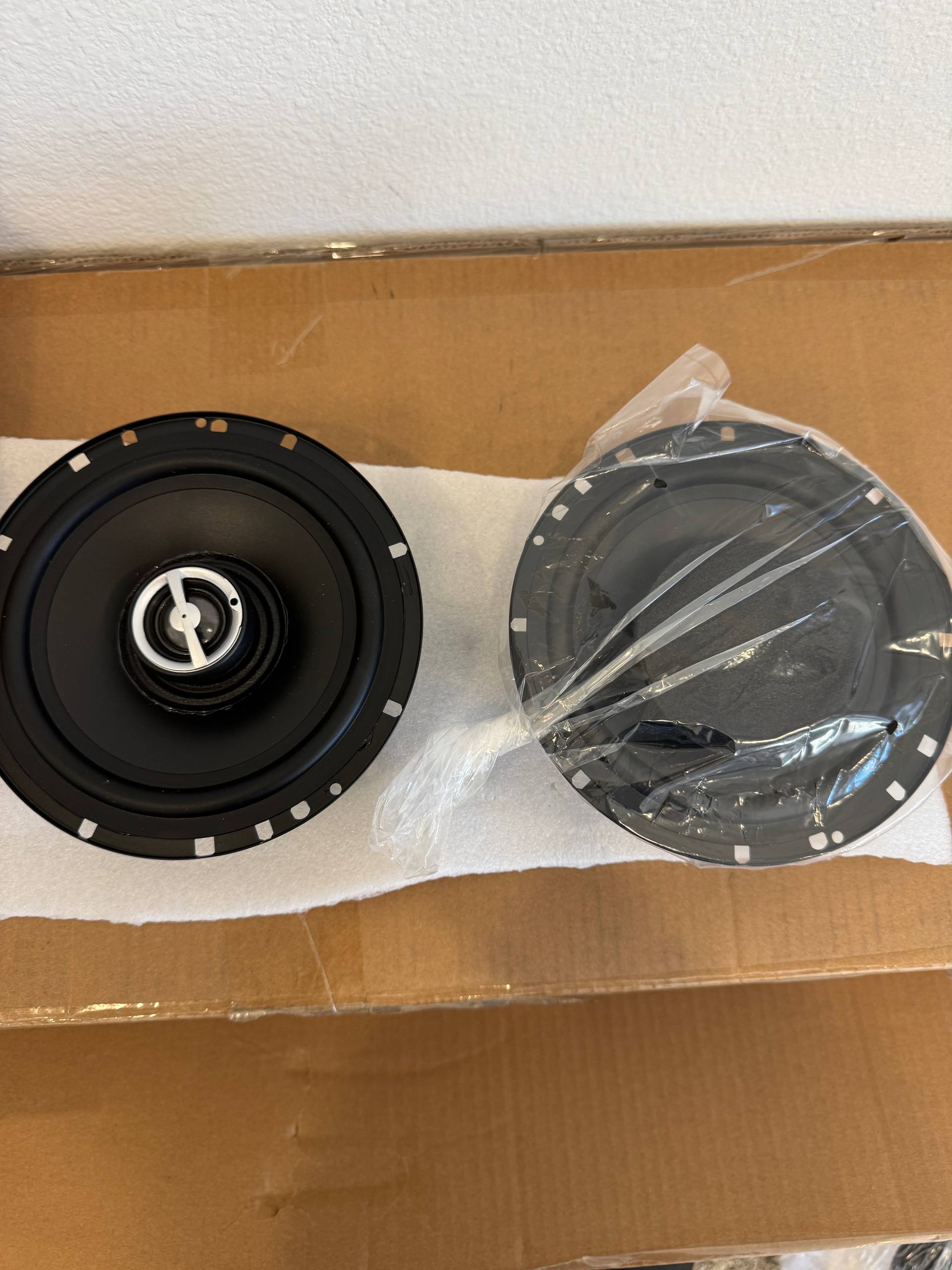 6.5-inch coaxial speakers — pair, new in factory plastic wrap. Black cone with integrated tweeter. Drop-in replacement for stock Harley-Davidson fairing or lower fairing speaker pods. Fits any 6.5-inch round speaker cutout. New, never installed.