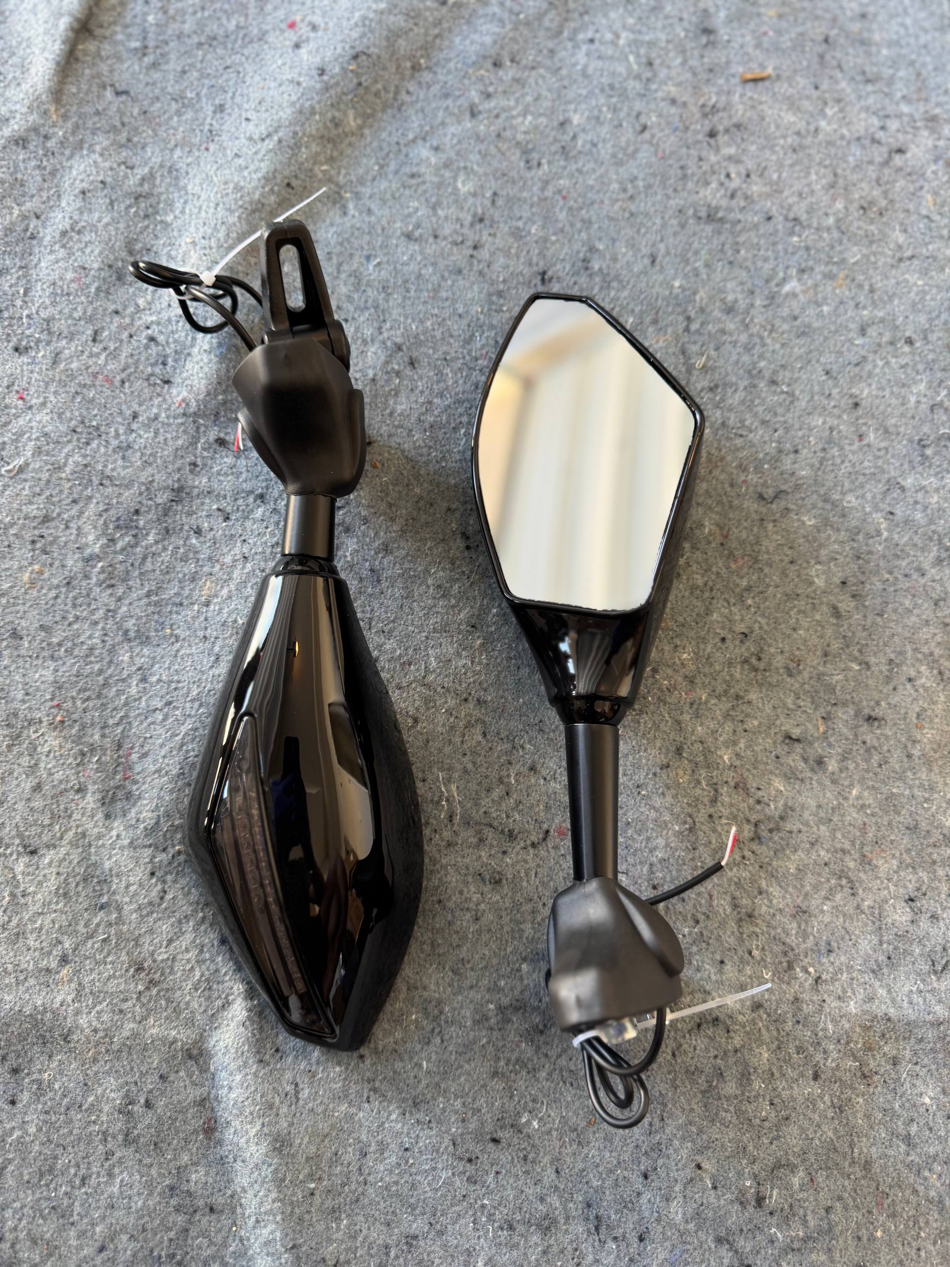Left and right side view mirrors with integrated amber LED turn signals for the Suzuki GSX-R600, GSX-R750, and GSX-R1000. Gloss black finish. Both mirrors include bare-wire leads for turn signal connection — no connectors required. Mounting hardware included. Verify fitment with your specific year before ordering.