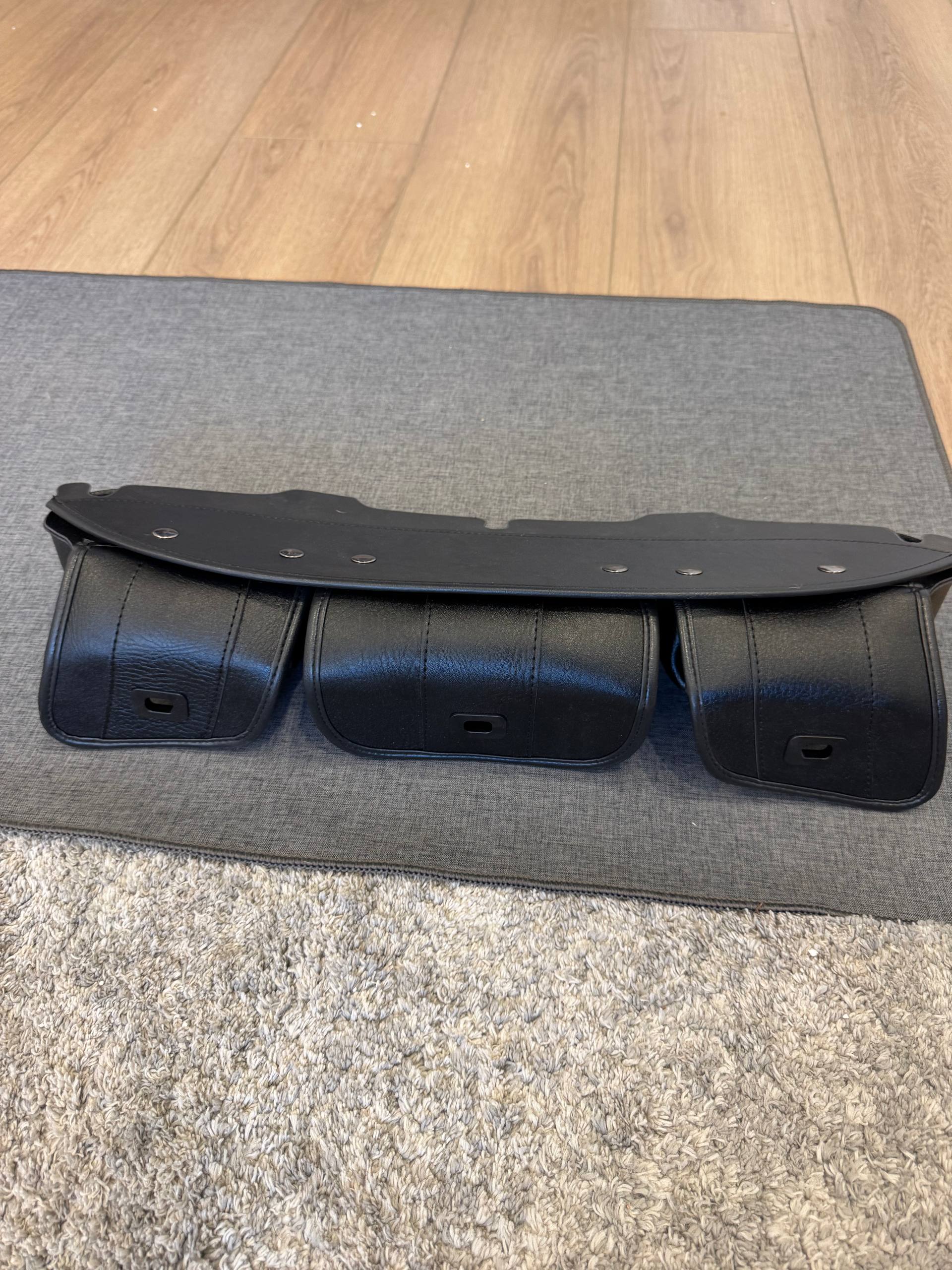 Black vinyl/leather inner fairing organizer bag for Harley-Davidson Touring. 3 snap-close pockets with velcro backing for secure mounting inside the lower leg fairings. Snap hardware on each pocket flap. Includes separate small individual pouches. Keeps phone, wallet, documents, and small items within easy reach while riding. New, unused.