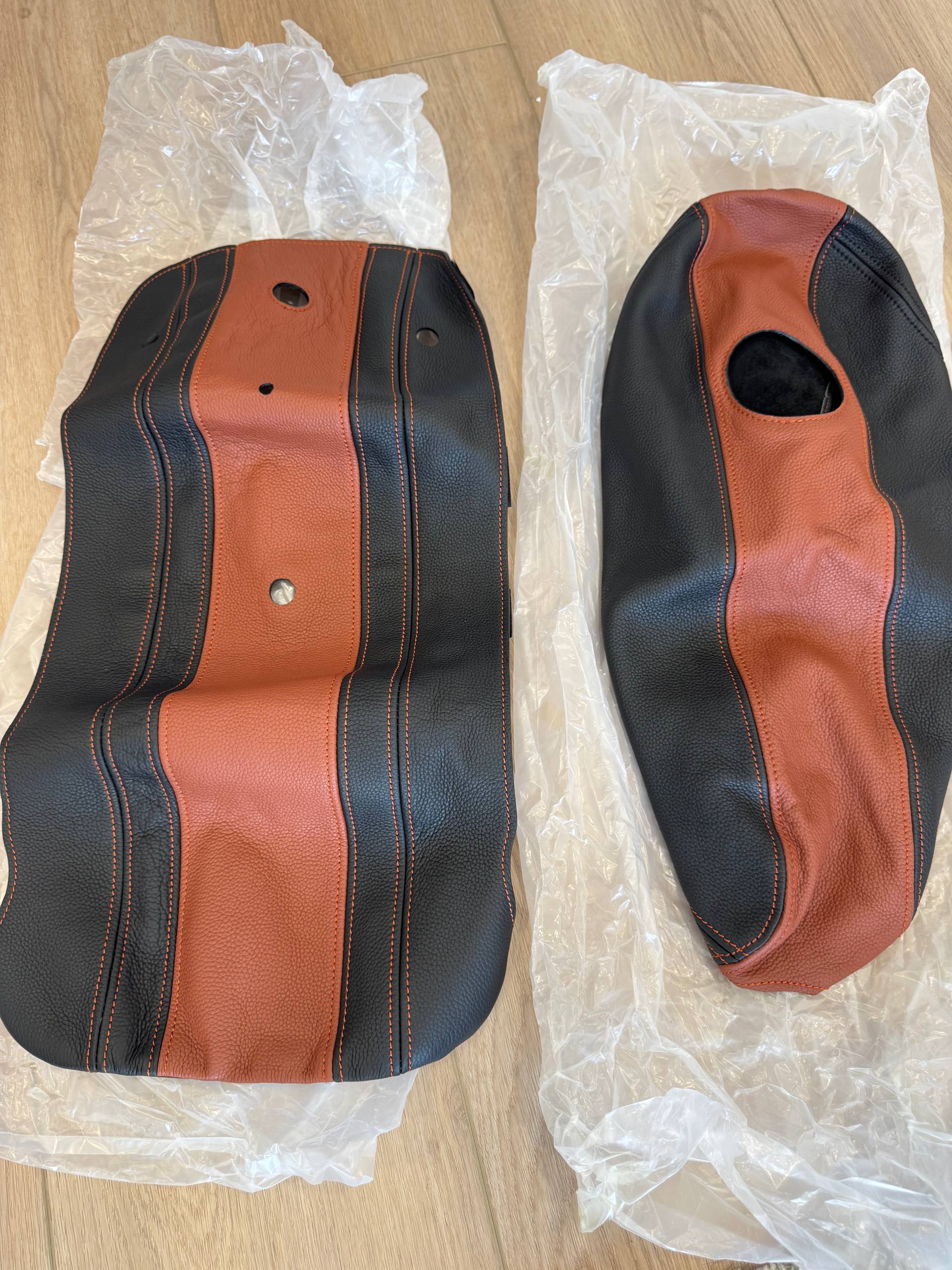 Leather gas tank cover and rear fender bib protector set for Harley-Davidson Sportster Iron 883 and 1200. Two-piece set: tank bib covers the top of the gas tank, fender protector wraps the rear fender. Black and rust/brown two-tone with contrast stitching. Protects from keys, belt buckles, and everyday scratches while adding custom style. New, unused.