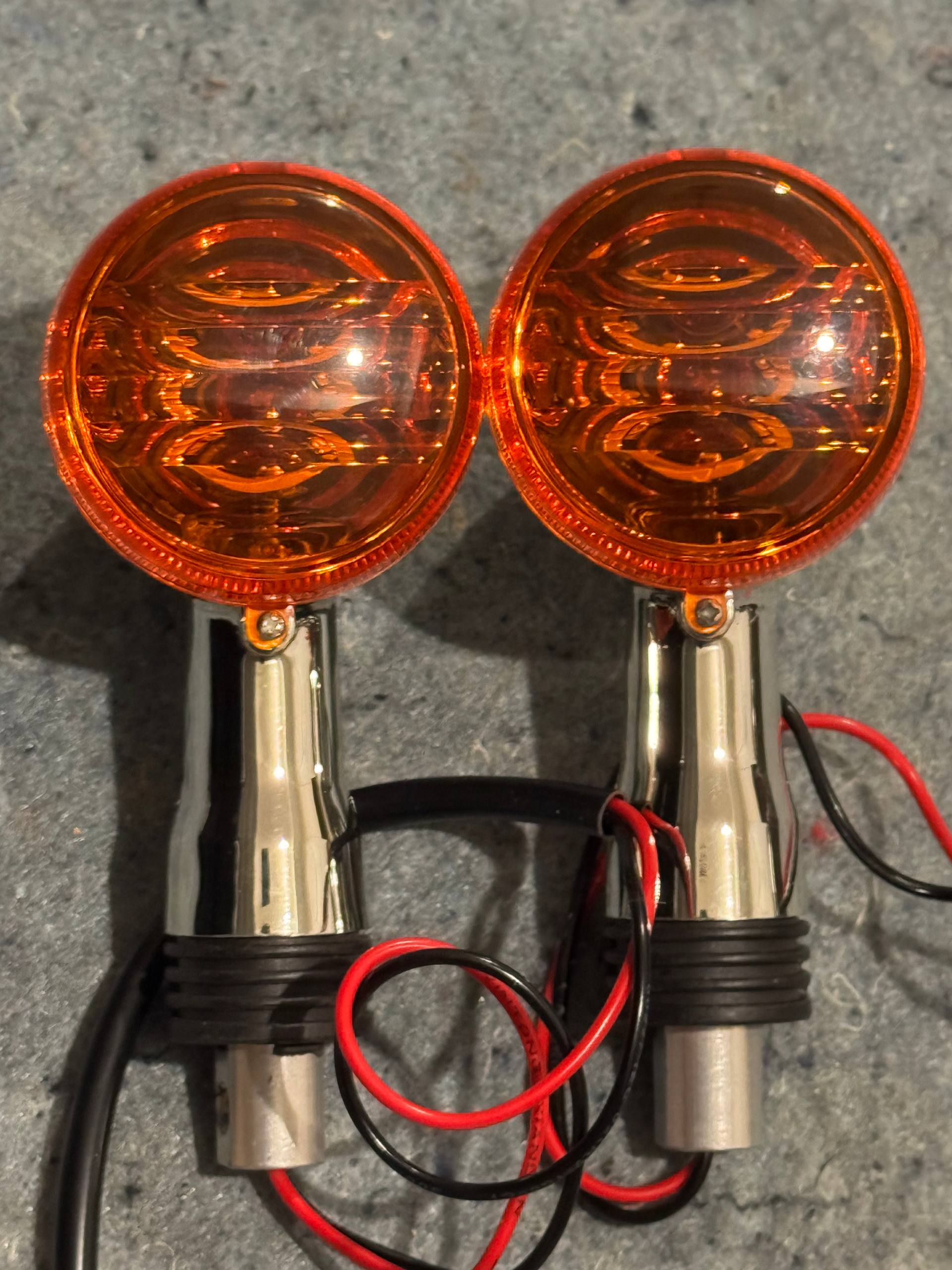 Chrome bullet-style amber LED turn signals for Suzuki Boulevard M109R / VRZ1800. Pair included. Verified working — lights up on power. Wires cut, will need connector ends before install. Fitment: Suzuki Boulevard M109R / VRZ1800 2006-2013.