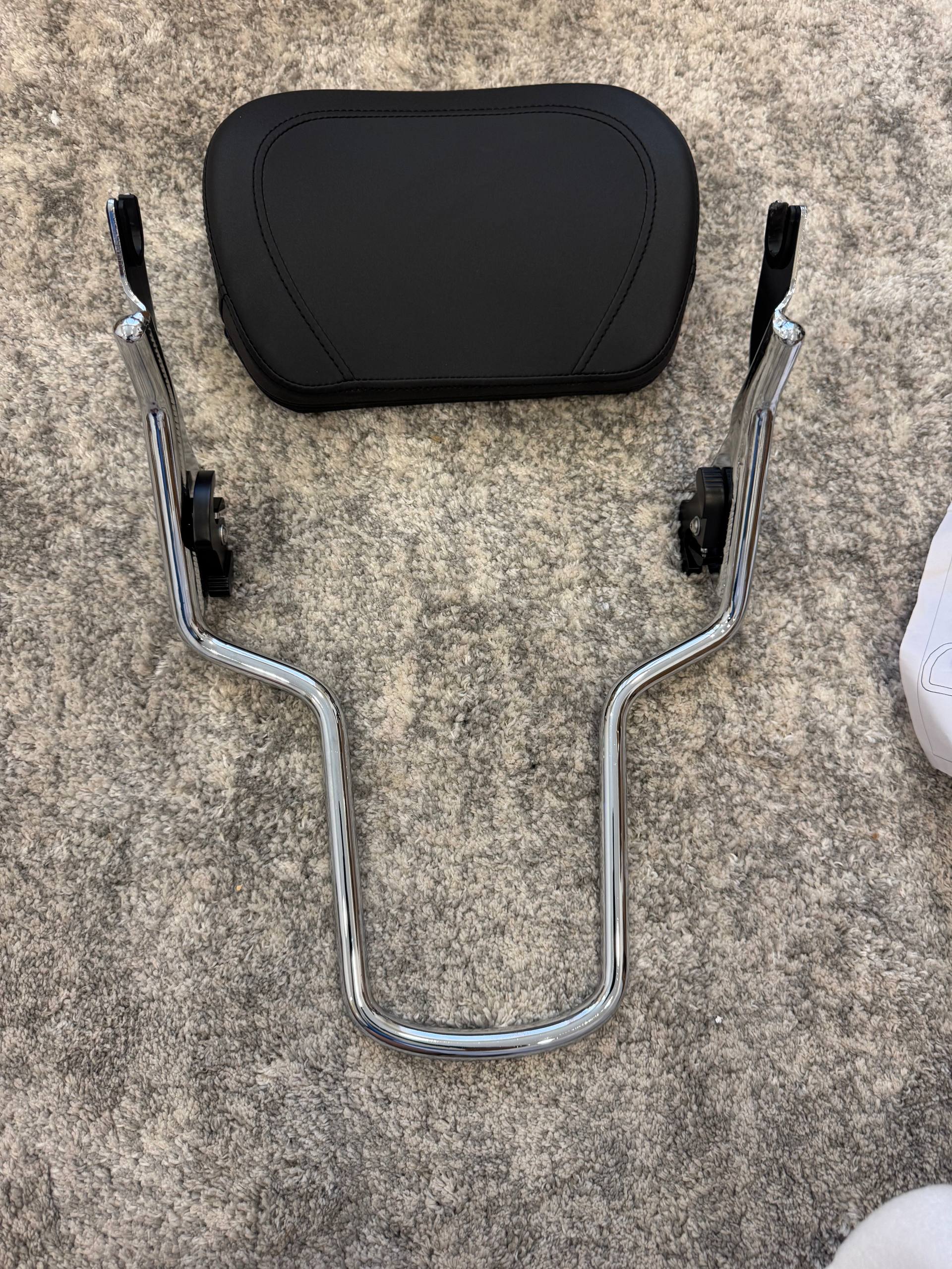 Chrome detachable passenger backrest with black padded cushion for Harley-Davidson Touring. Quick-release docking point mounting system — installs and removes in seconds without tools. Chrome steel support arms with padded black vinyl backrest. Mounts behind the passenger seat for lower back support on long rides. New, never installed.