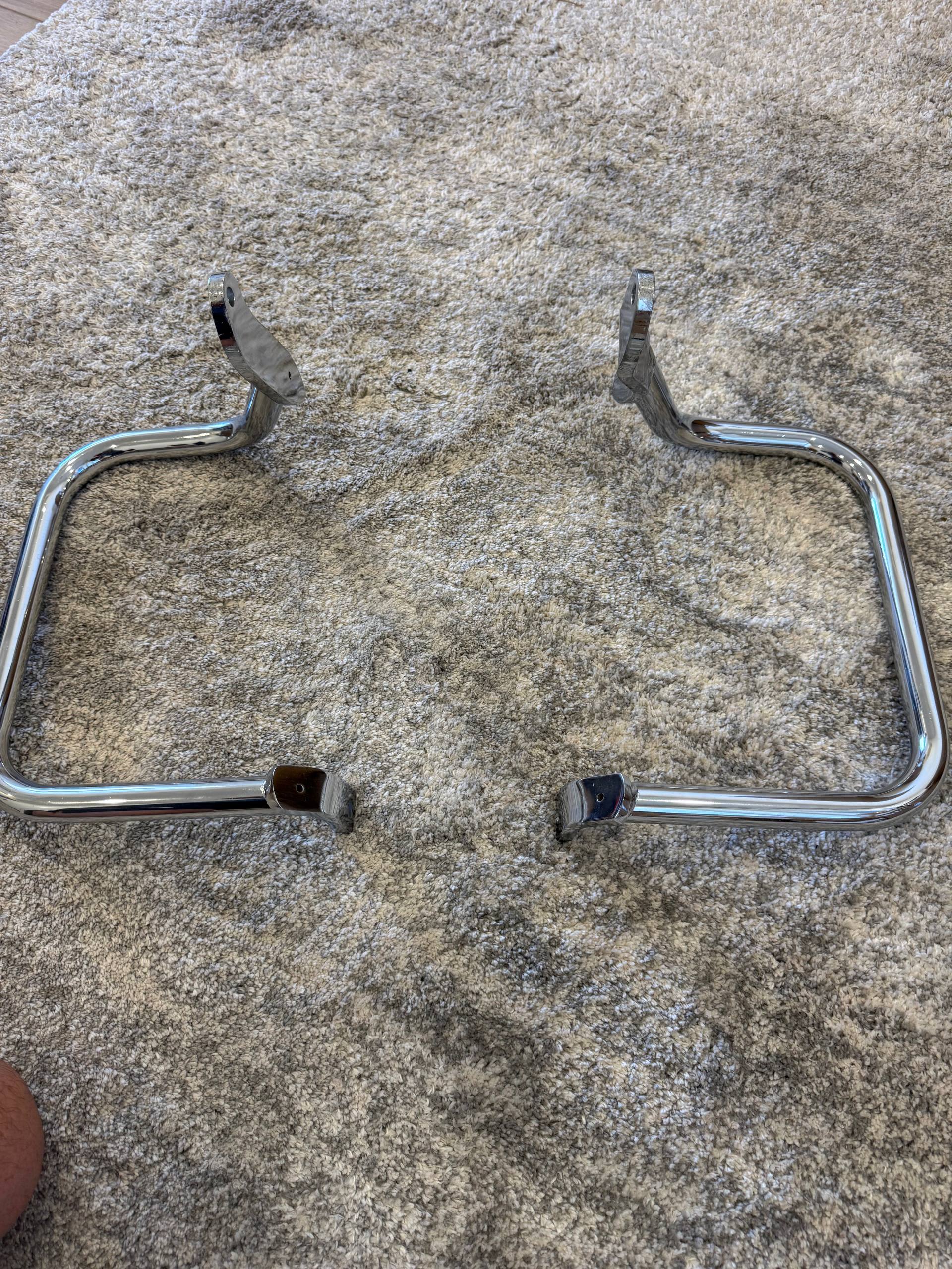 Aftermarket chrome engine guard / crash bar for Harley-Davidson Touring models. Large rectangular design with 4-point mounting system — 2 upper swept brackets with round mounting holes, 2 lower flat L-brackets. Mirror chrome finish. Heavy-gauge steel tubing construction. Fits Road King, Electra Glide, Street Glide, Road Glide, and Ultra Classic Touring models. New condition, never installed.