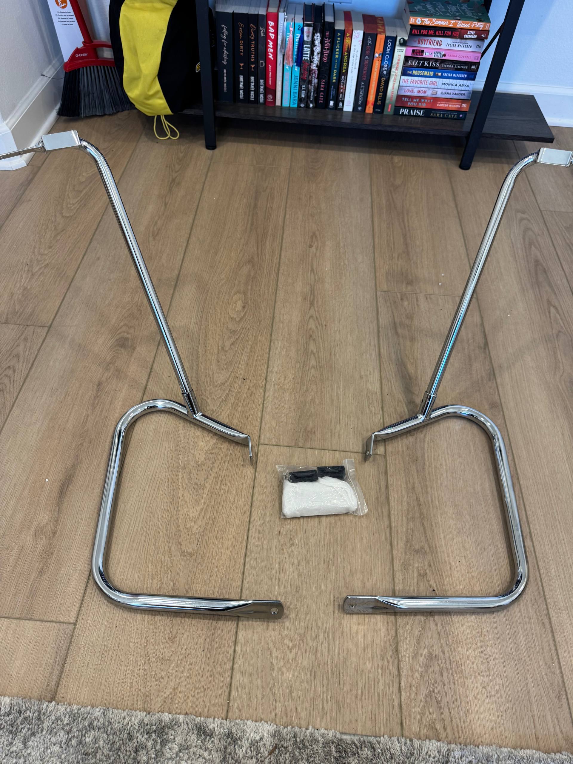 Chrome saddlebag support guard rails — left and right pair with mounting hardware bag. Protect your saddlebags from road debris and leg contact. Polished chrome steel construction. Bolt-on installation. New, never installed.