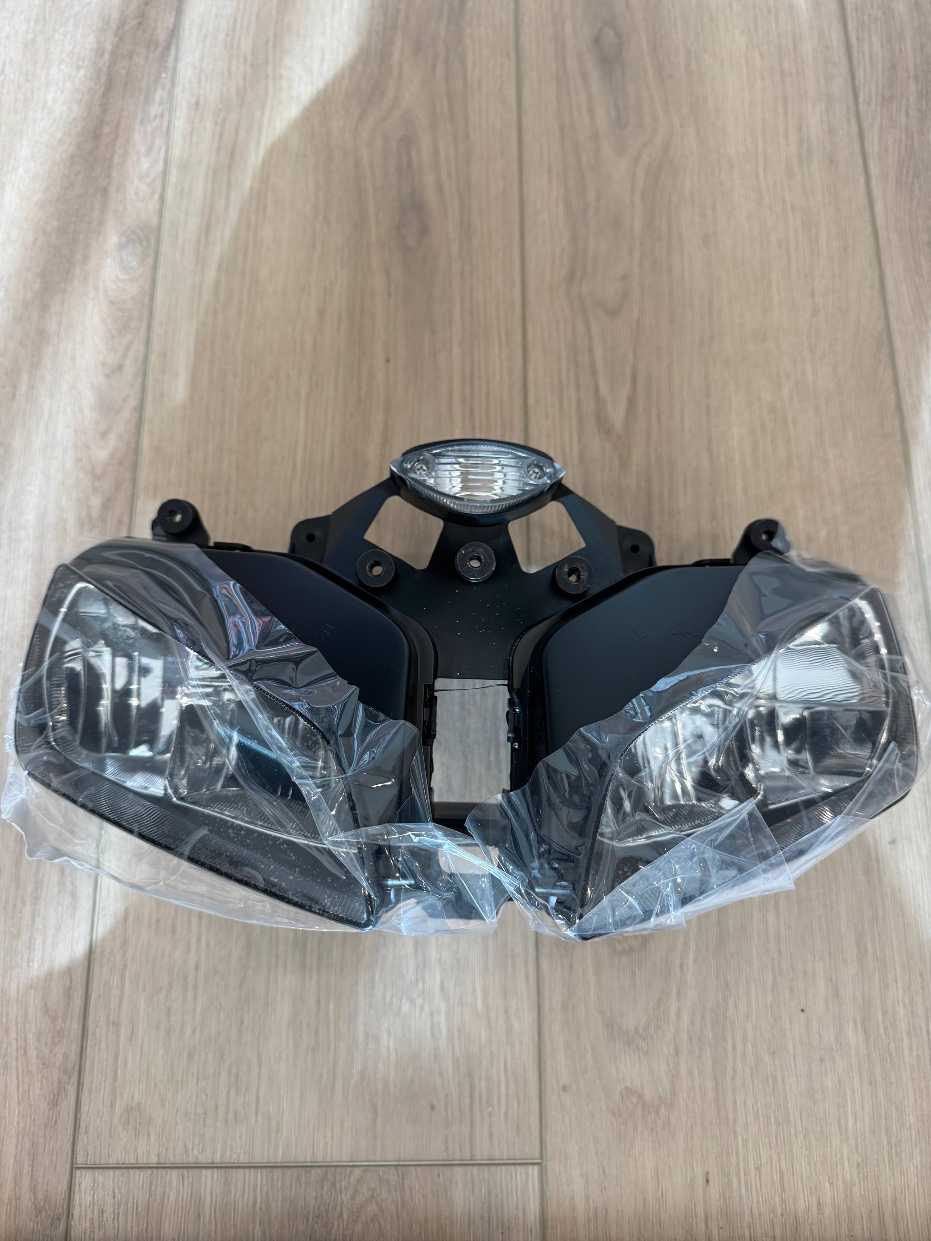 Left and right headlight assemblies for Honda CBR600RR 2007-2012. Black housing with clear lens. Still wrapped in factory protective plastic. New, never installed. Sold as a pair.