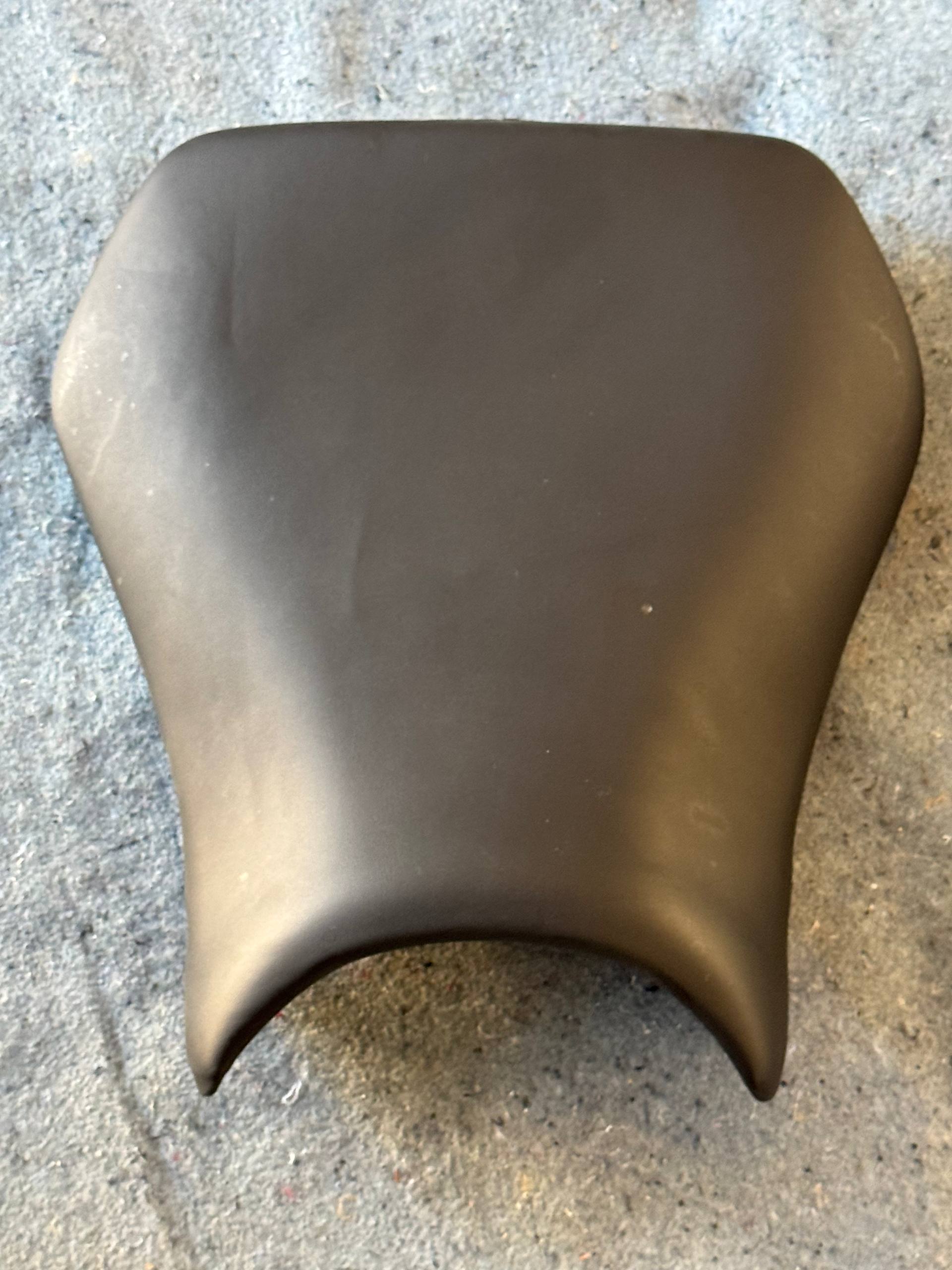 OEM front driver seat for the 2011-2018 Suzuki GSX-R600 and GSX-R750. Black matte vinyl cover in good used condition — some light surface marks on top but no rips, tears, or cracking. Plastic base and seat latch fully intact. Direct bolt-on replacement.