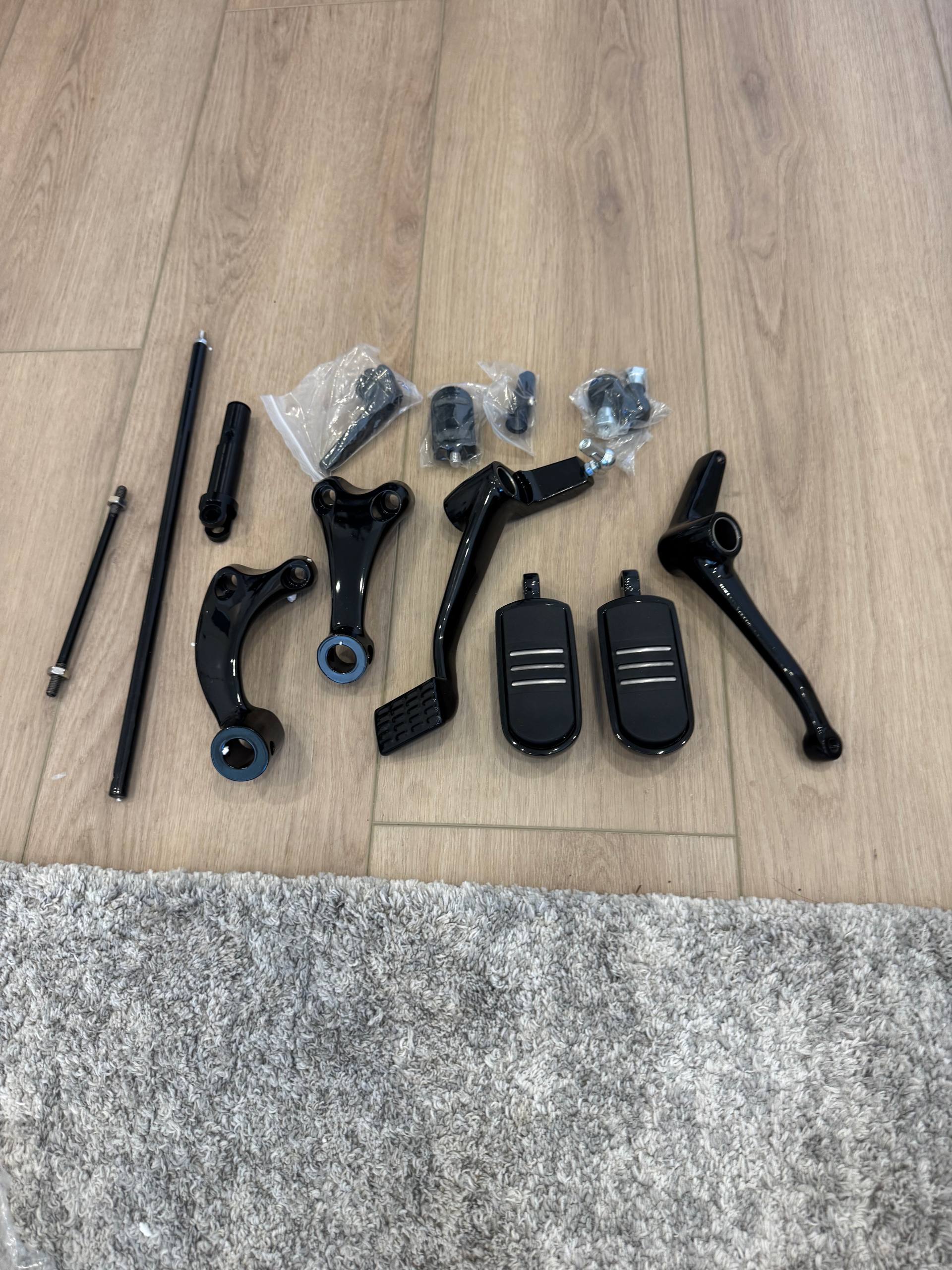Complete gloss black forward controls conversion kit for Harley-Davidson Softail. Includes shift lever, brake lever, two floorboard-style foot pegs with chrome accent lines, shift linkage rod, brake rod, curved mounting brackets with sealed bearings, and all mounting hardware. Gloss black powder coat finish throughout. Bolt-on kit moves foot controls forward for a more relaxed riding position. New, never installed.