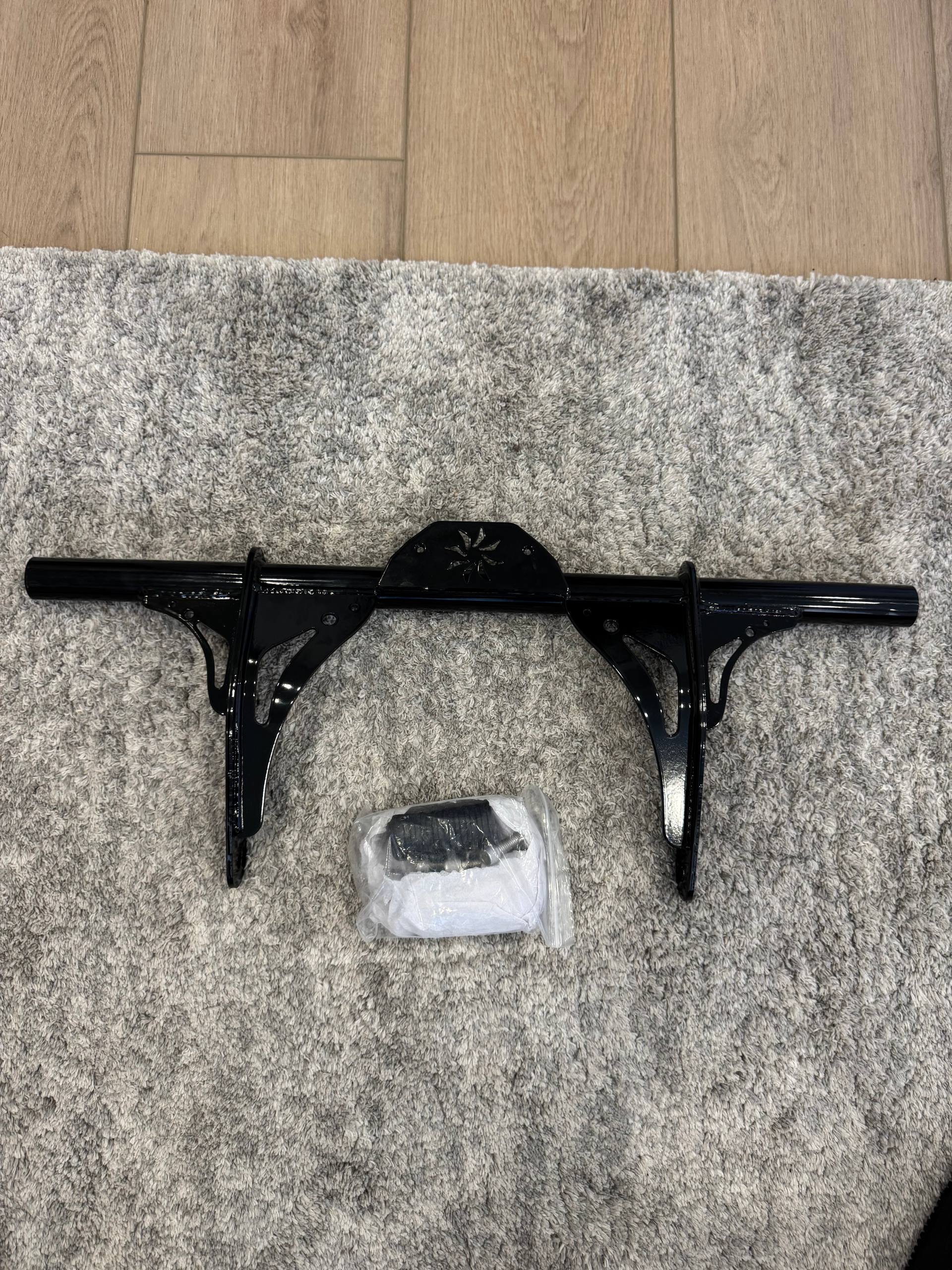 TCMT front highway engine guard crash bar for Harley-Davidson Dyna models 2006-2017. Gloss black powder coat finish with decorative center medallion plate and highway footpeg mounting points. Heavy-duty steel construction. Includes all mounting hardware. New in box, never installed. Part number XF240209.