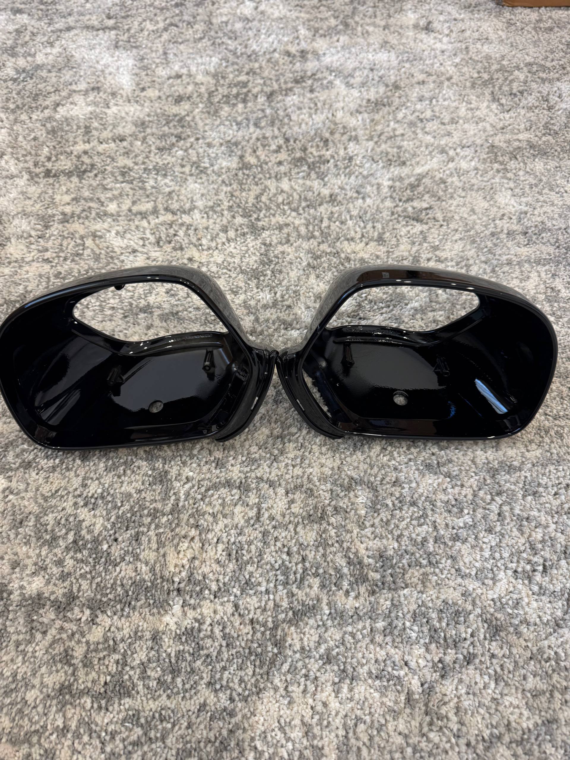 Gloss black mirror back caps with integrated turn signal cutout — left and right pair. Large opening for mirror glass, smaller opening for turn signal lens. High-gloss vivid black ABS construction. Snap-on replacement for stock mirror caps. New, never installed.