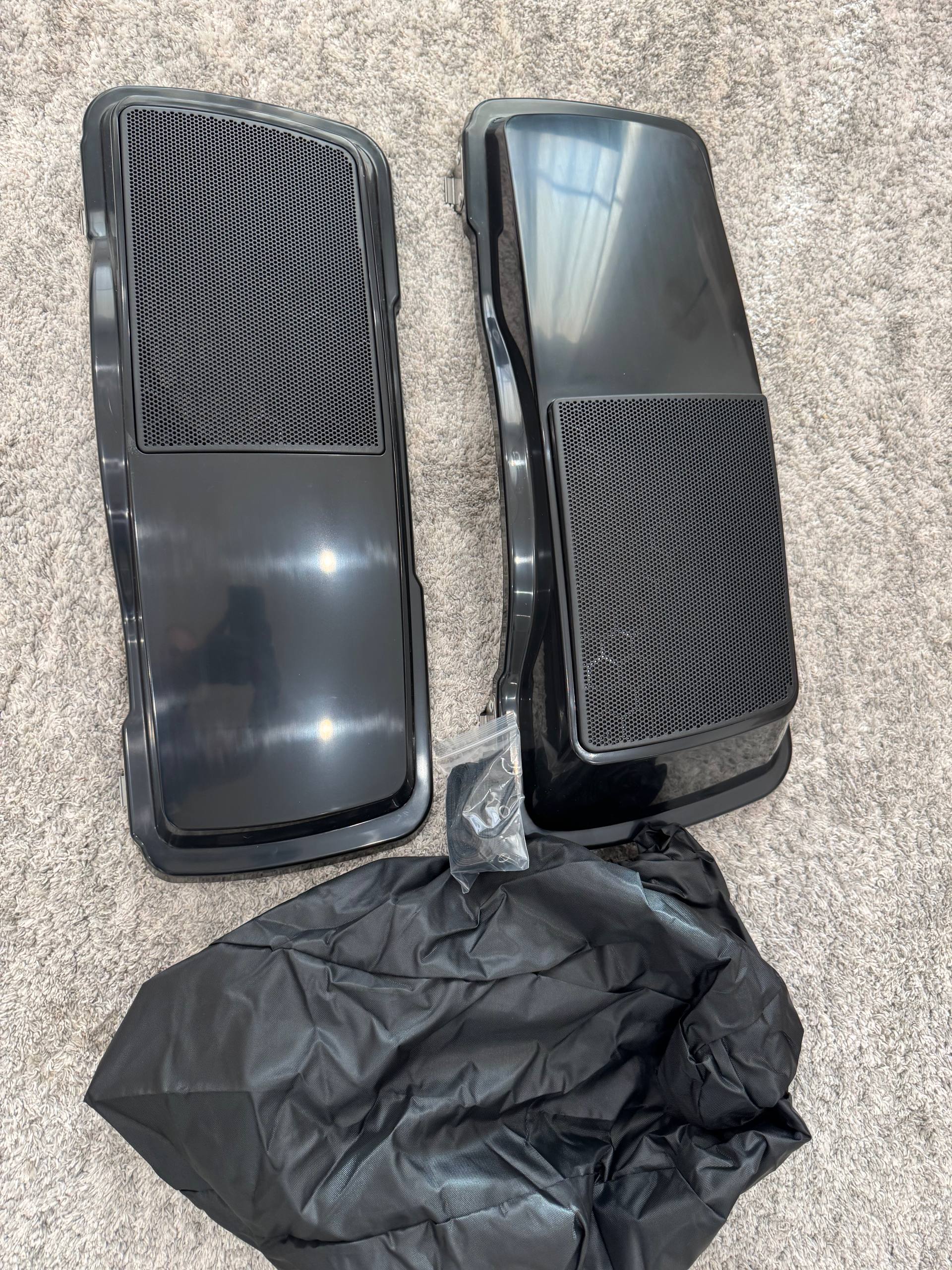 HardDrive Products (HDD-S0005) saddlebag speaker lids — left and right pair. Gloss black ABS with integrated mesh speaker grilles. Drop-in replacement for stock saddlebag lids — adds speaker capability without cutting. Weatherproof protective covers included. New, unused. Retails for $231.26 at Summit Racing.