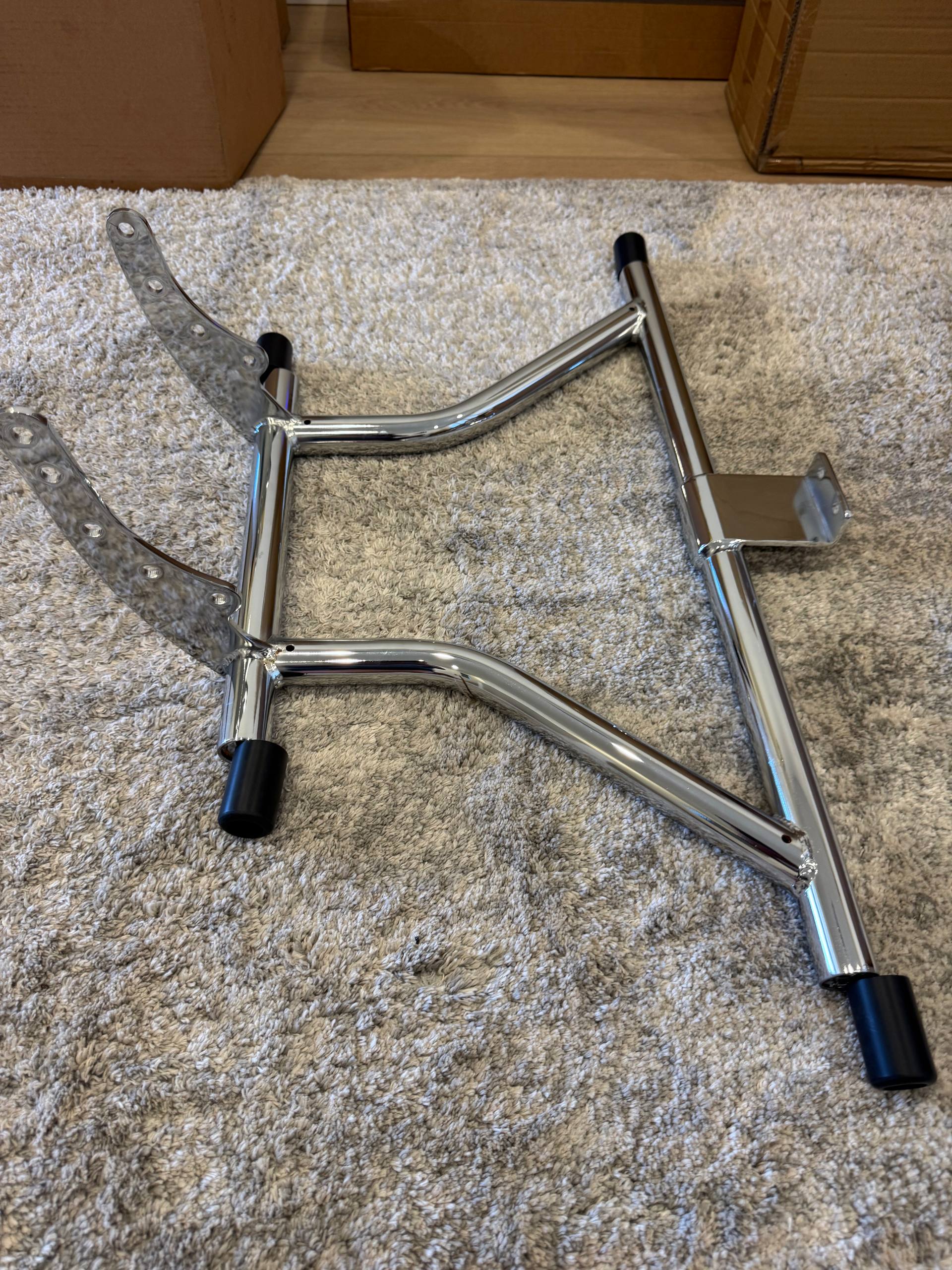 Brand new chrome engine guard / crash bar for Harley-Davidson. Heavy-gauge steel tubing with a mirror chrome finish. Includes 4 rubber end caps and mounting hardware (bolts included). T-bracket bottom mount design for secure frame attachment. Protects engine cases and lower frame in the event of a tip-over. New in packaging, never installed.