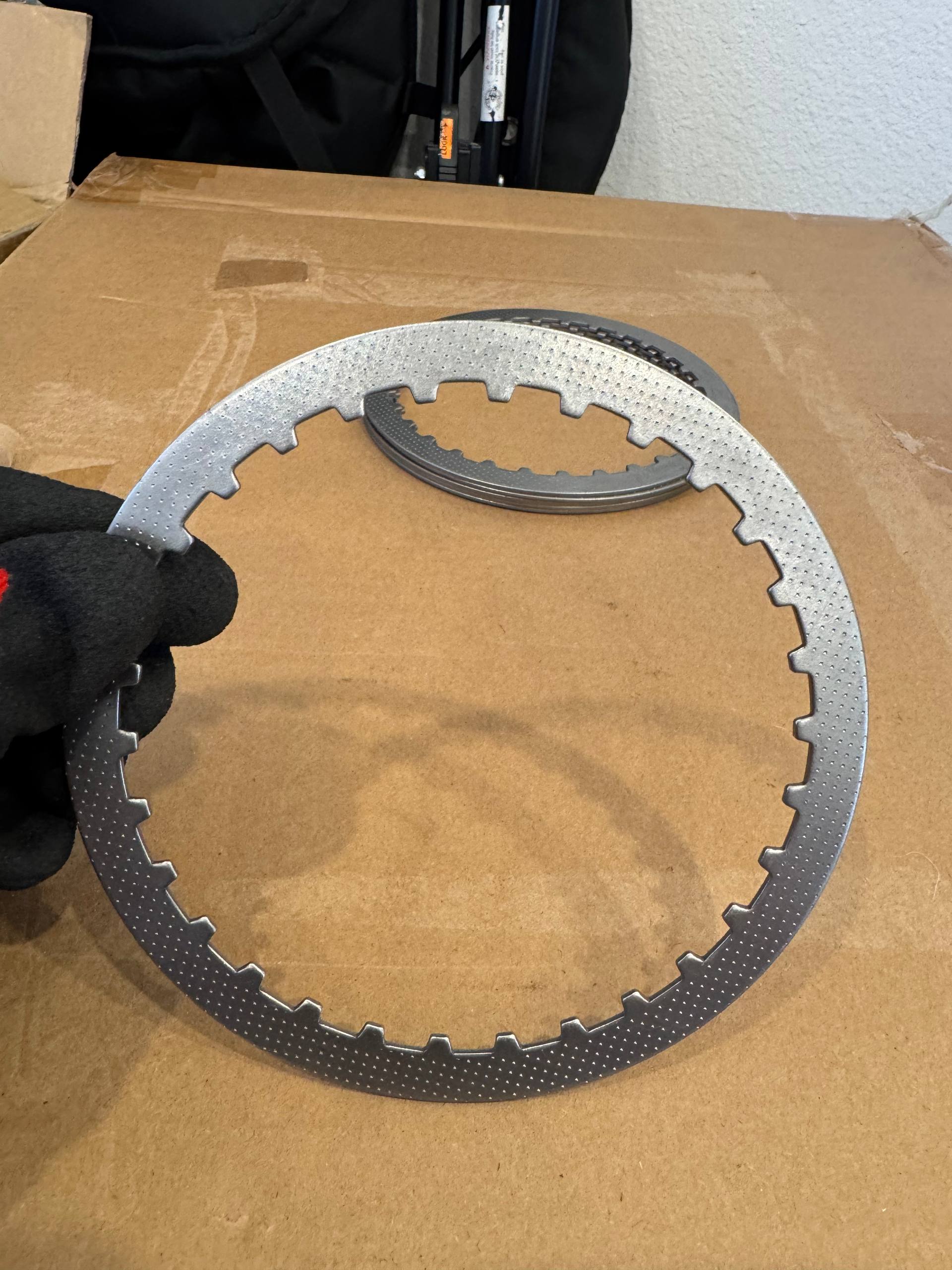 Set of 6 aftermarket clutch plates for Harley-Davidson Big Twin motors. Includes steel drive plates (large external-splined rings) and fiber friction plates. Two different diameters included — inner and outer clutch pack plates. New, unused condition. Compatible with Twin Cam 88, 96, 103, and 110 engines. Verify plate count and dimensions match your application before ordering.