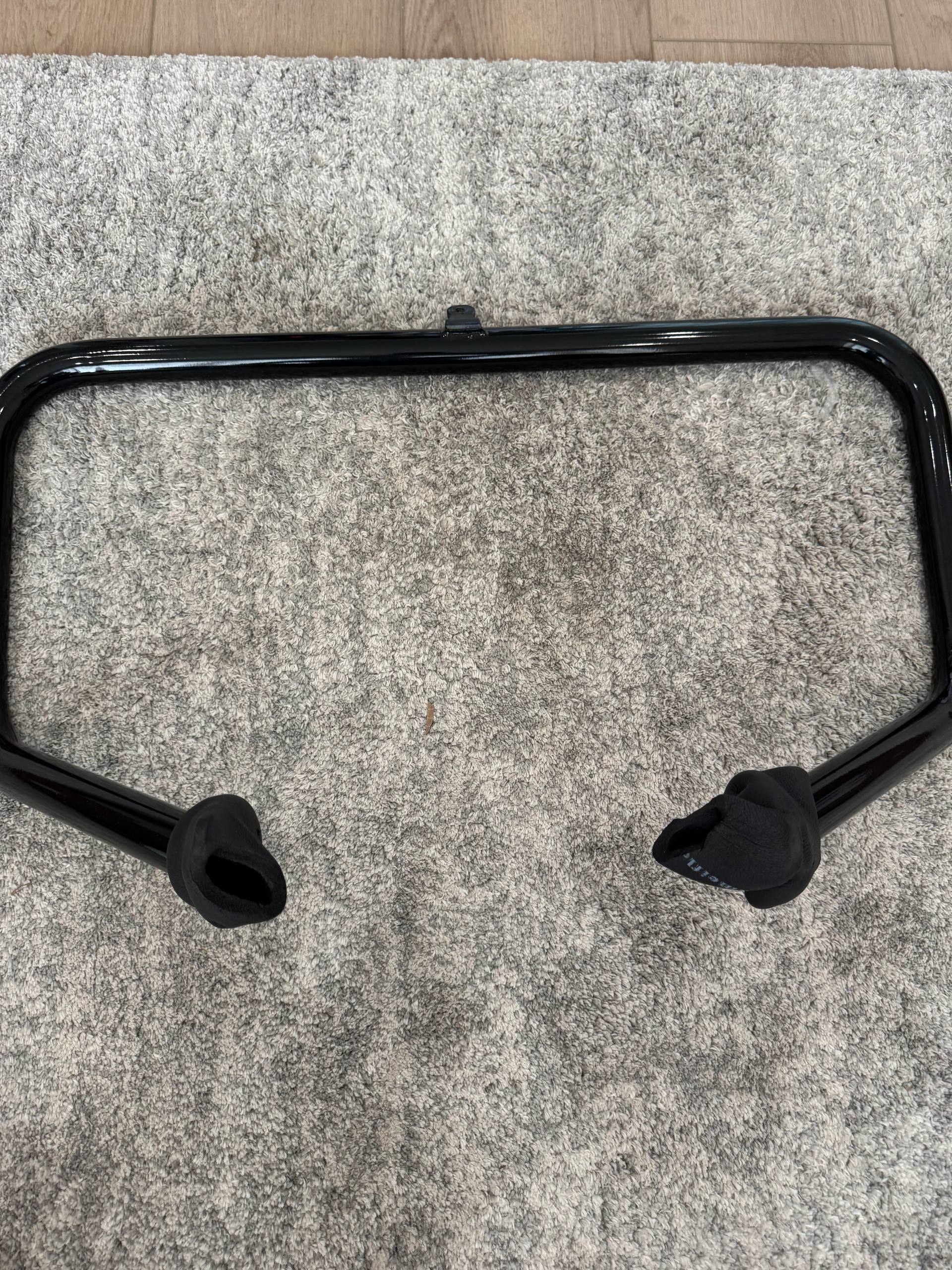 HogWorkz gloss black engine guard / crash bar for Harley-Davidson Softail 2018-2026. Triangular frame design with rubber-tipped mounting feet. Protects the engine cases in a tip-over. Direct bolt-on installation. New, unused. Retails for $179.98 on RevZilla.