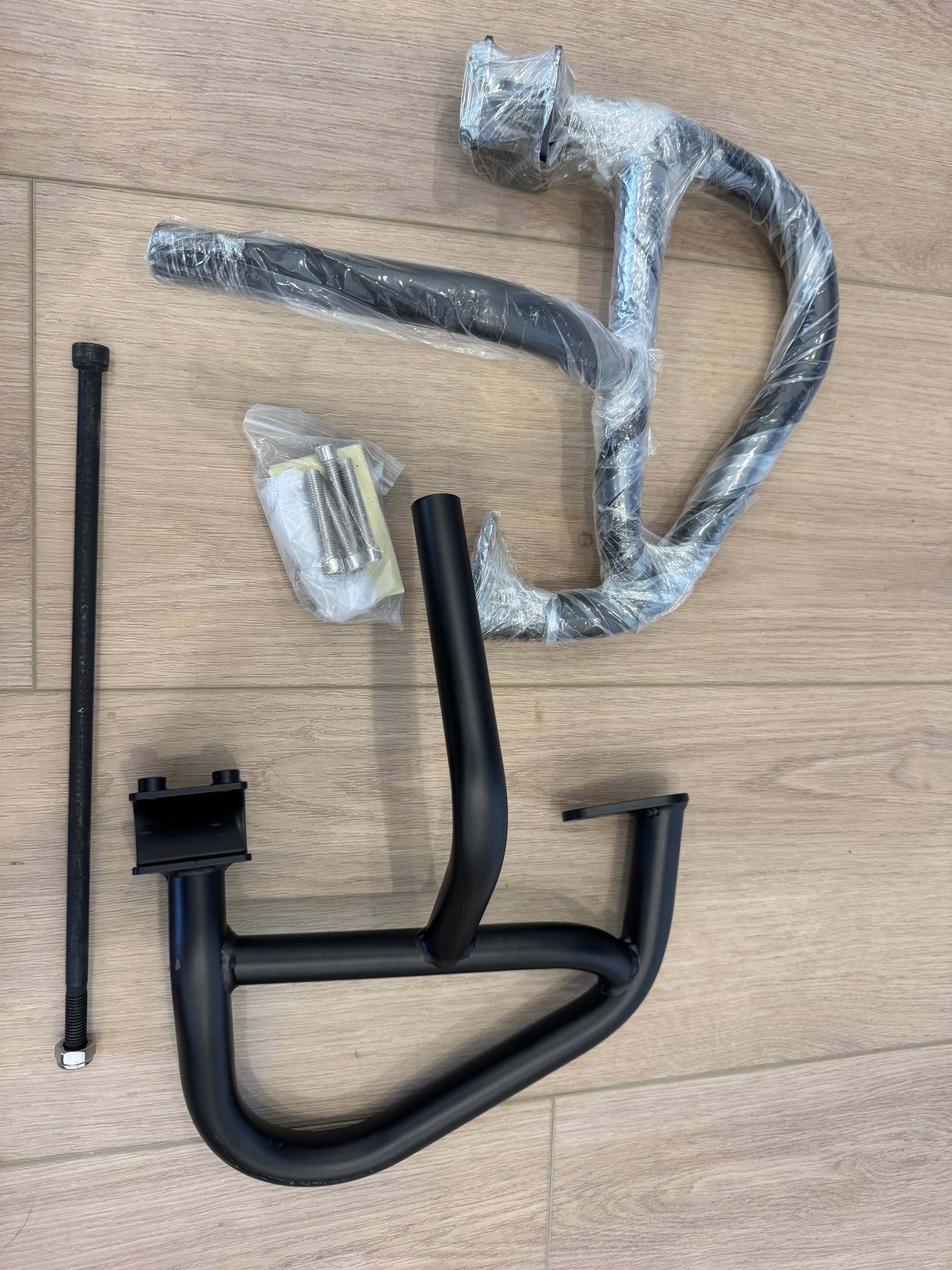 Matte black engine guard crash highway bar for Honda Rebel CMX300 and CMX500 2017-2023. Teardrop-loop design wraps around the engine for protection in a tip-over. Includes mounting clamp bracket, long mounting bolt, and hardware bag with bolts and spacers. Matte black powder coat finish. New, never installed.