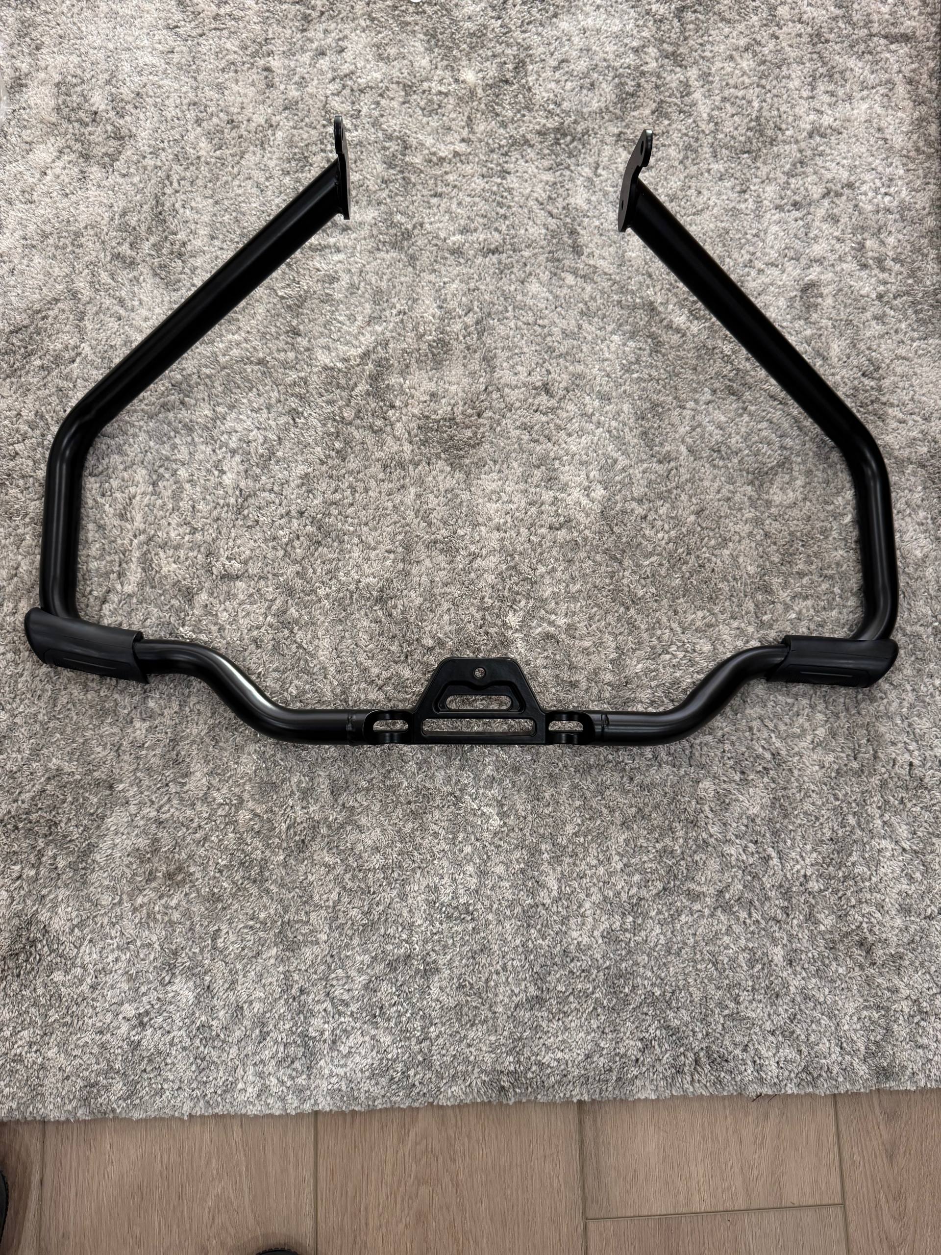 Matte black steel engine guard crash bar for Harley-Davidson Softail 2018 and up. Wide crossbar design with mounting brackets. Protects engine cases in a tip-over. New, never installed — aftermarket. Used OEM sells for $89 on eBay, this is new.