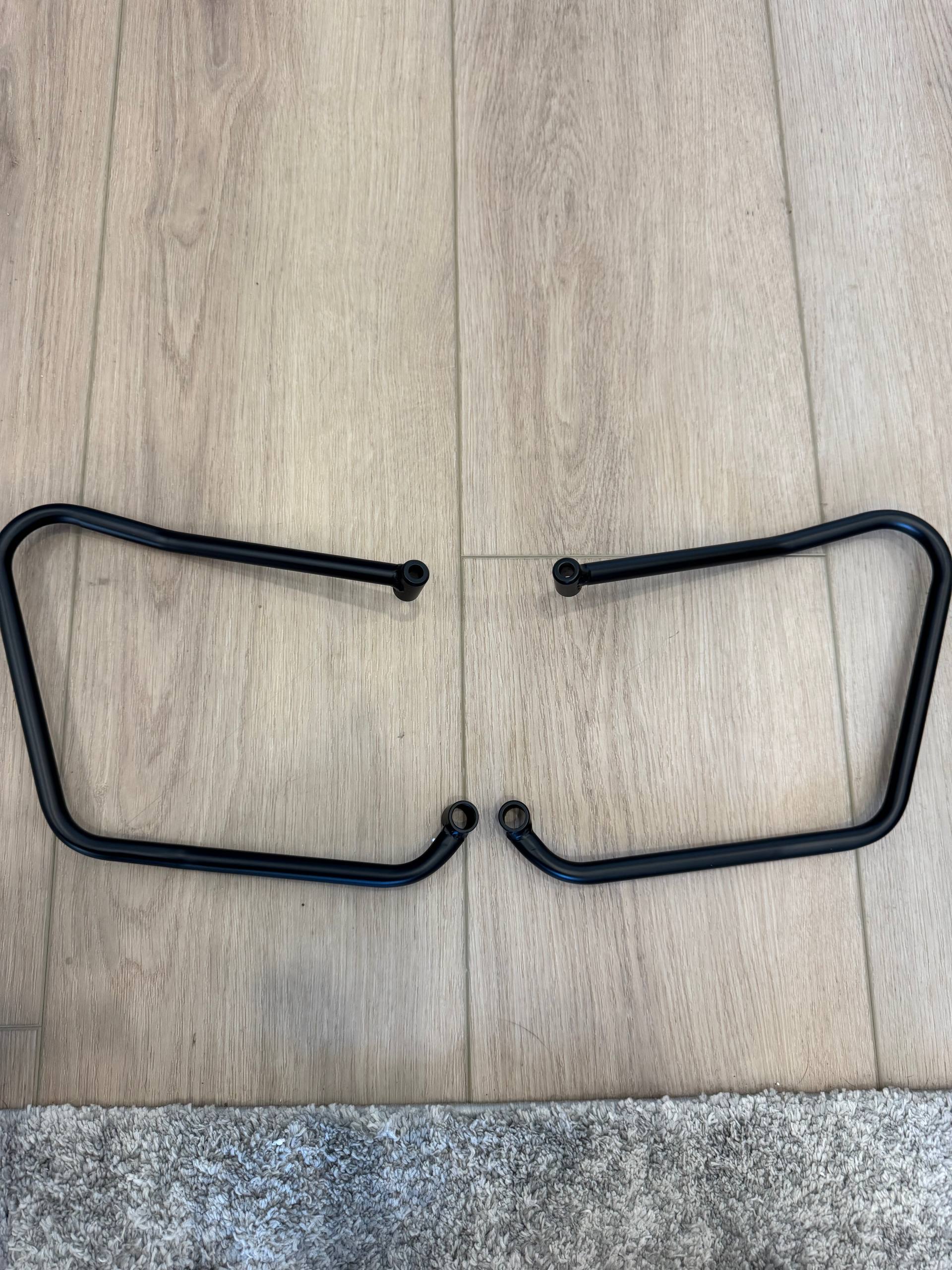 Matte black saddlebag support guard rails — left and right pair. Rectangular tubular steel frame with mounting tabs at each corner. Protects saddlebags from road debris and leg contact. Matte black powder coat finish. New, never installed.