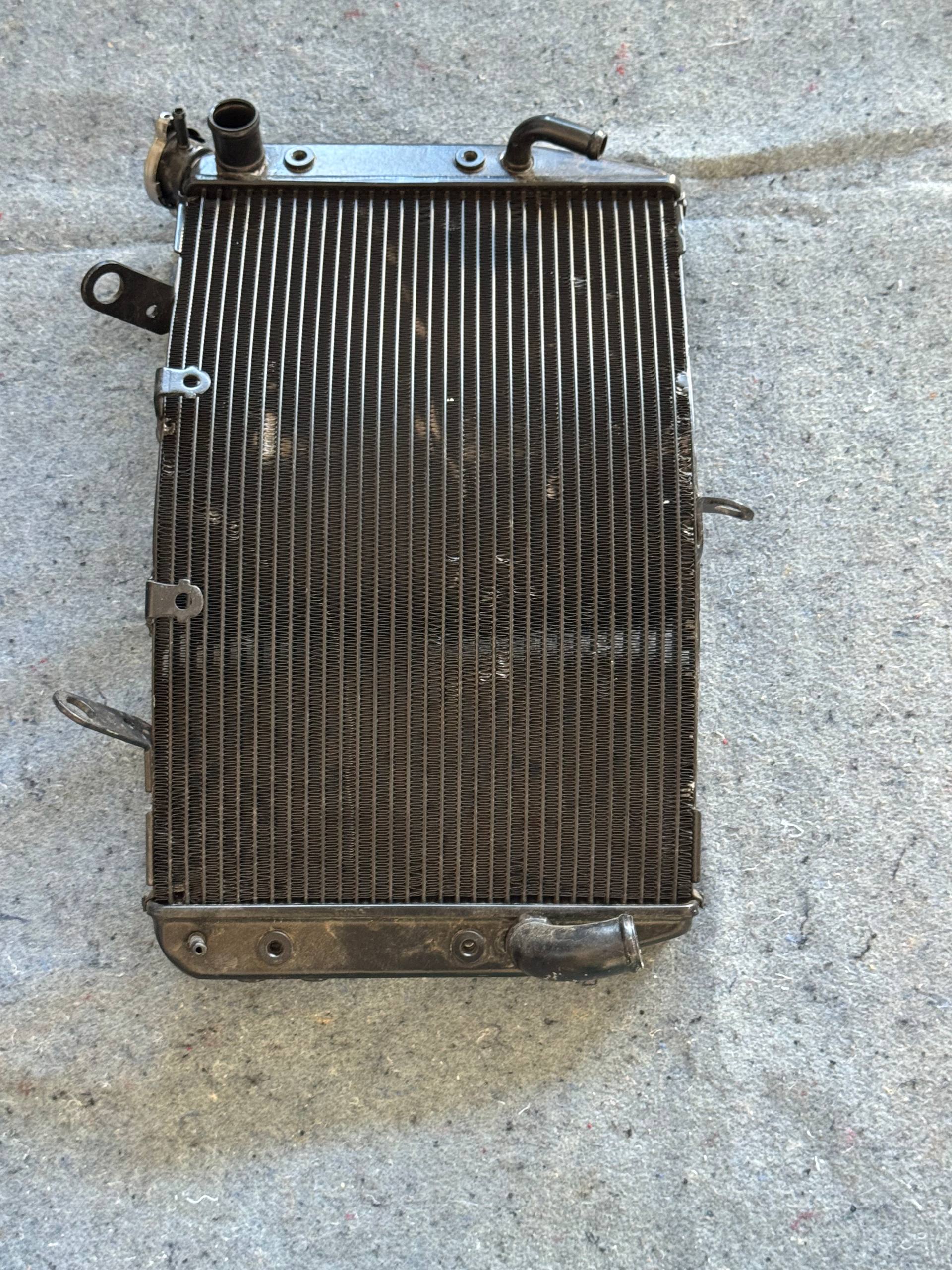 Used sportbike radiator with original pressurized radiator cap. Sold for parts or repair only — not guaranteed leak-free. Aluminum core construction with side mounting brackets. Good candidate for fin straightening and pressure testing. Includes the OEM-style radiator cap. Verify fitment with your specific make and model before ordering.
