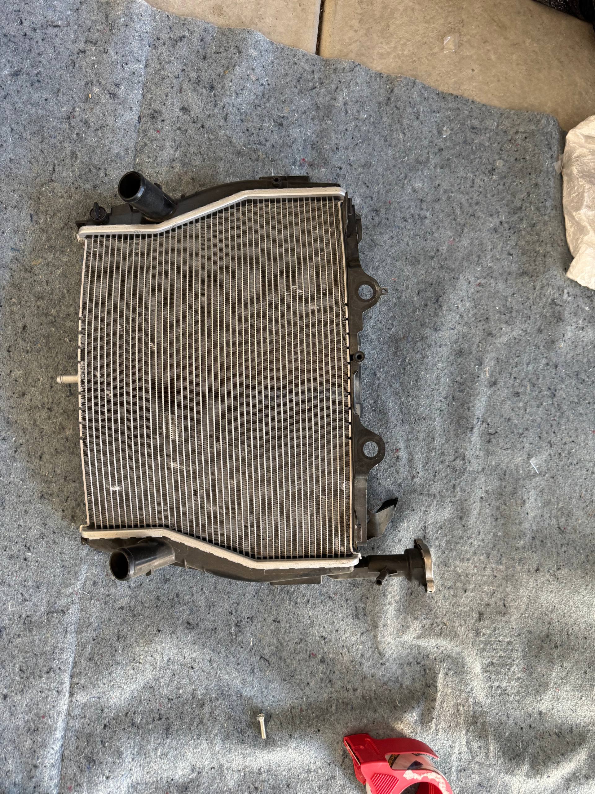 OEM radiator with original radiator cap for the 2009-2019 BMW S1000RR. Aluminum core with black plastic end tanks. All mounting brackets intact. Hose connections in good condition. Good used condition — inspect photos closely. Includes the OEM pressurized radiator cap. Retails new for $400+.