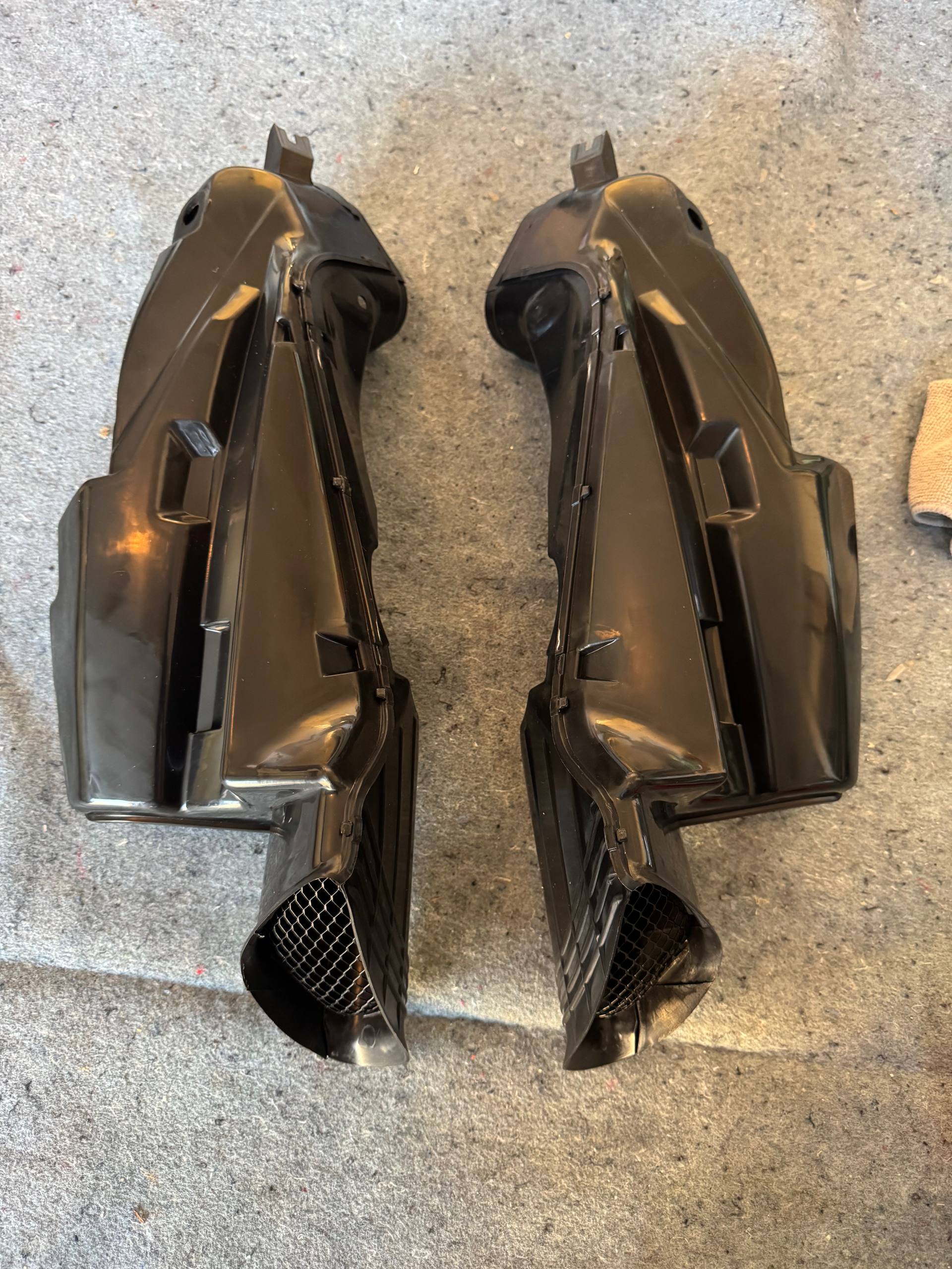 OEM left and right RAM air intake tubes/ducts for the 2006-2007 Suzuki GSX-R600 and GSX-R750. Black plastic with mesh air filter screen intact at the inlet opening. All mounting tabs present. Good used condition. Direct bolt-on fitment.