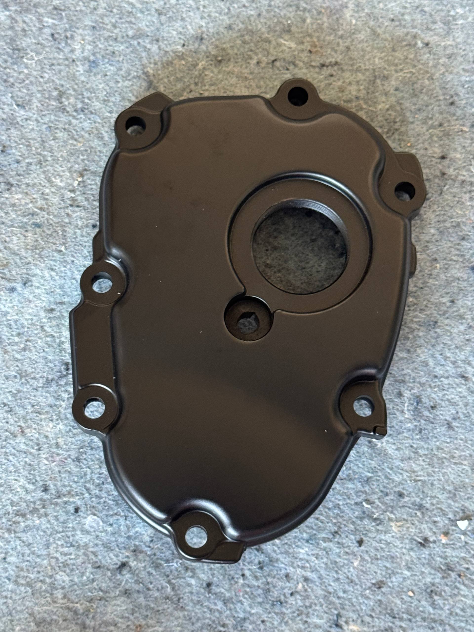 OEM Yamaha right-side engine oil pump cover with paper gasket. Matte black finish, clean condition. Fitment: Yamaha YZF-R6 (YZFR6) 2006-2020. Includes matching gasket.
