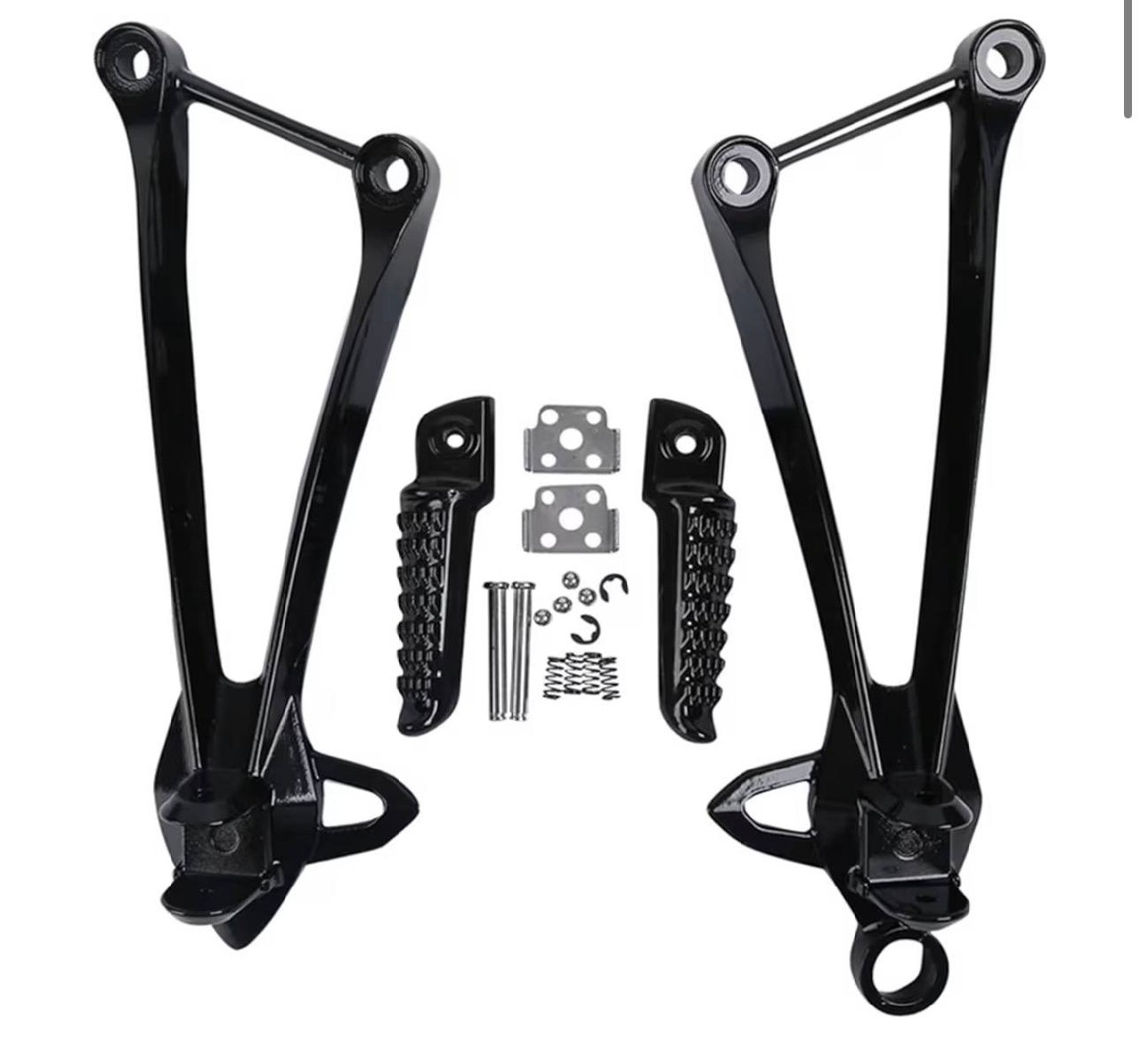 Rear footrest passenger foot peg bracket kit in gloss black. Includes left and right brackets, ribbed foot pegs, mounting plates, hinge pins, springs, ball bearings, and snap clips — complete hardware included. Fitment: Kawasaki Ninja ZX-6R 2009-2017, ZX-10R 2008-2010.