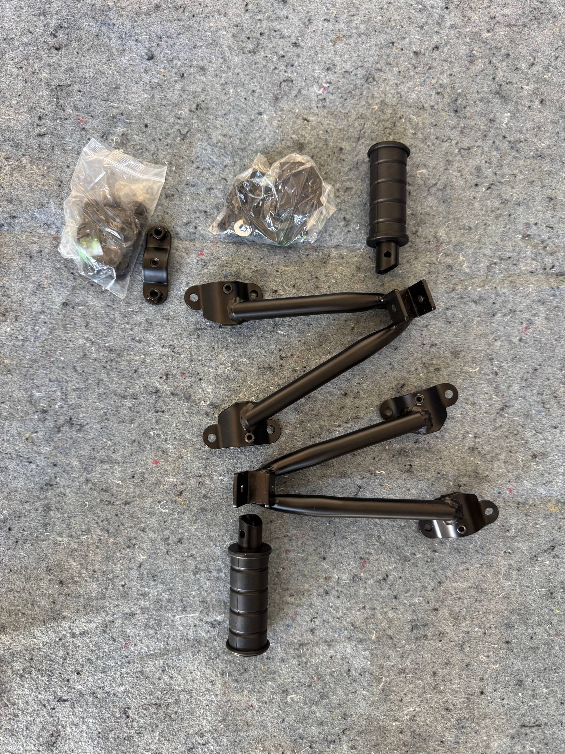 Aftermarket rear passenger foot peg bracket kit for the 2015 and newer Kawasaki Vulcan 650 (VN650). Matte black finish. Includes left and right mounting arms, rubber-grip foot pegs, mounting brackets, and all hardware. New, uninstalled. Direct bolt-on fitment.