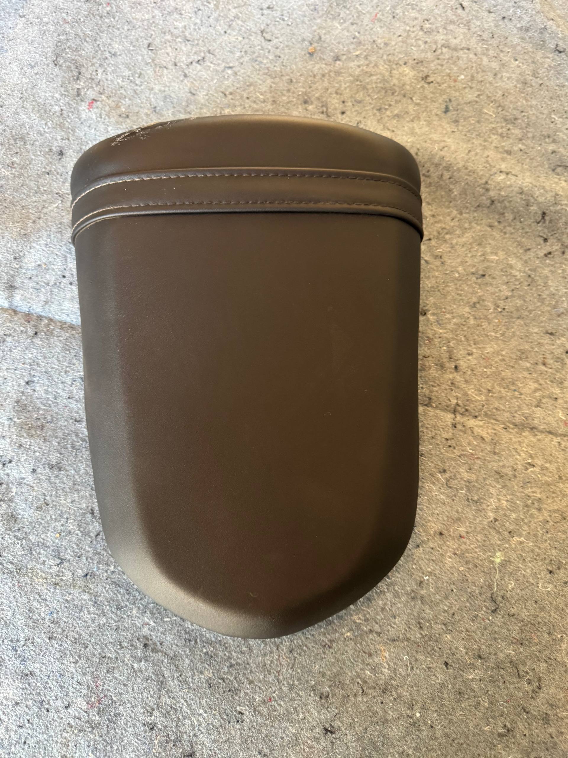 OEM rear passenger pillion/tandem seat for the 2003-2004 Suzuki GSX-R1000. Black vinyl, brand new condition overall — vinyl is clean with no tears or rips. Has some glue residue on one side that needs cleaning — comes right off with adhesive remover. All mounting hardware intact. Direct bolt-on fitment.