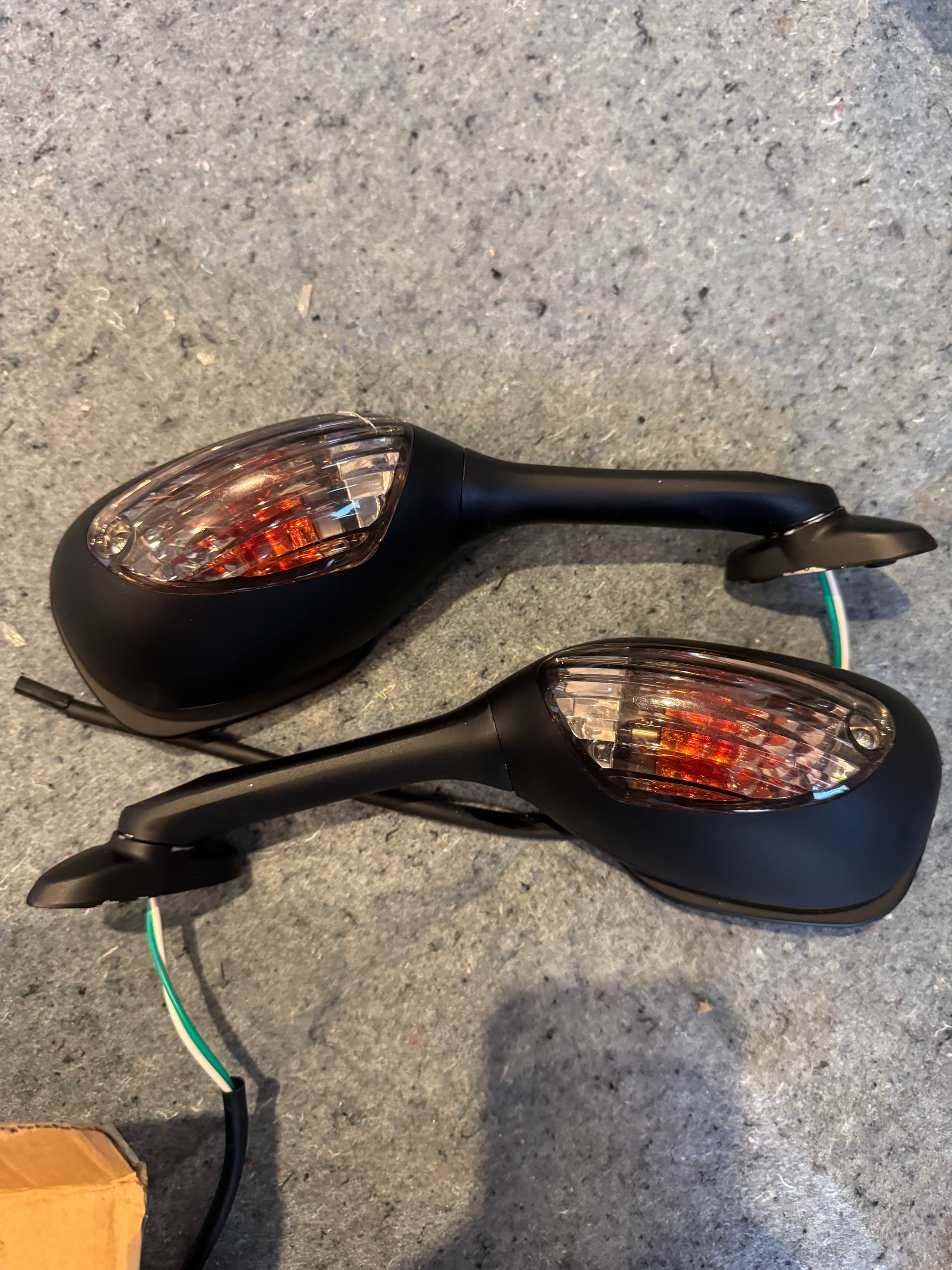 Rearview mirrors with integrated turn signals for the 2006-2015 Suzuki GSX-R600, GSX-R750, and GSX-R1000. Sold as-is — returned as possibly defective. Good for parts, repair, or testing. Black oval housing, 2-pin wired connector. Priced to move.