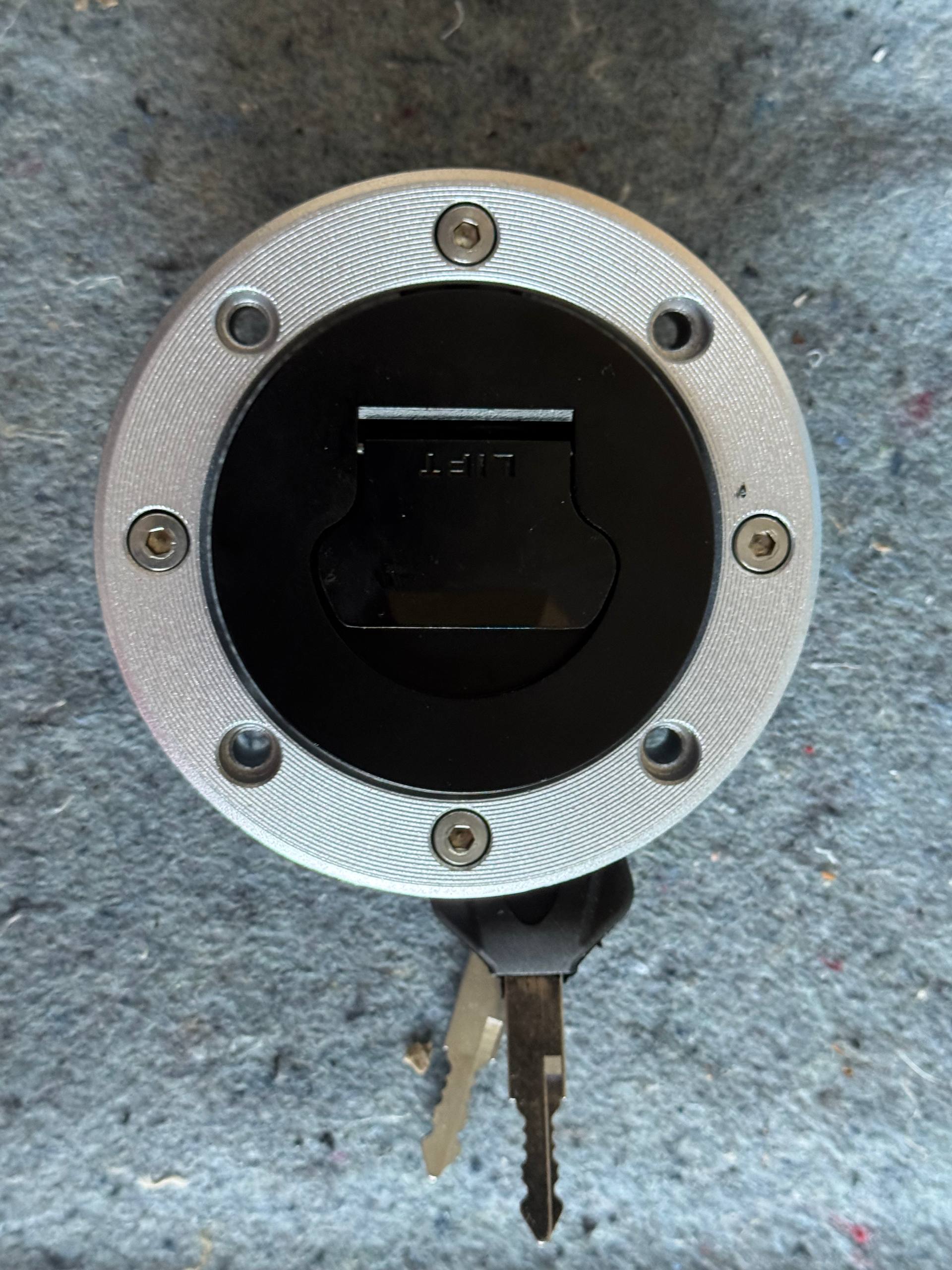 SLMOTO replacement fuel tank gas cap with matched keys. Silver billet-style aluminum cap with 6-bolt pattern, key lock mechanism, and flip-open inner lid. Fitment: Suzuki GSX-R600 1997-2003, SV650 / SV650S 1999-2002, GSX-R750 2001-2003, TL1000S 1997-2001.
