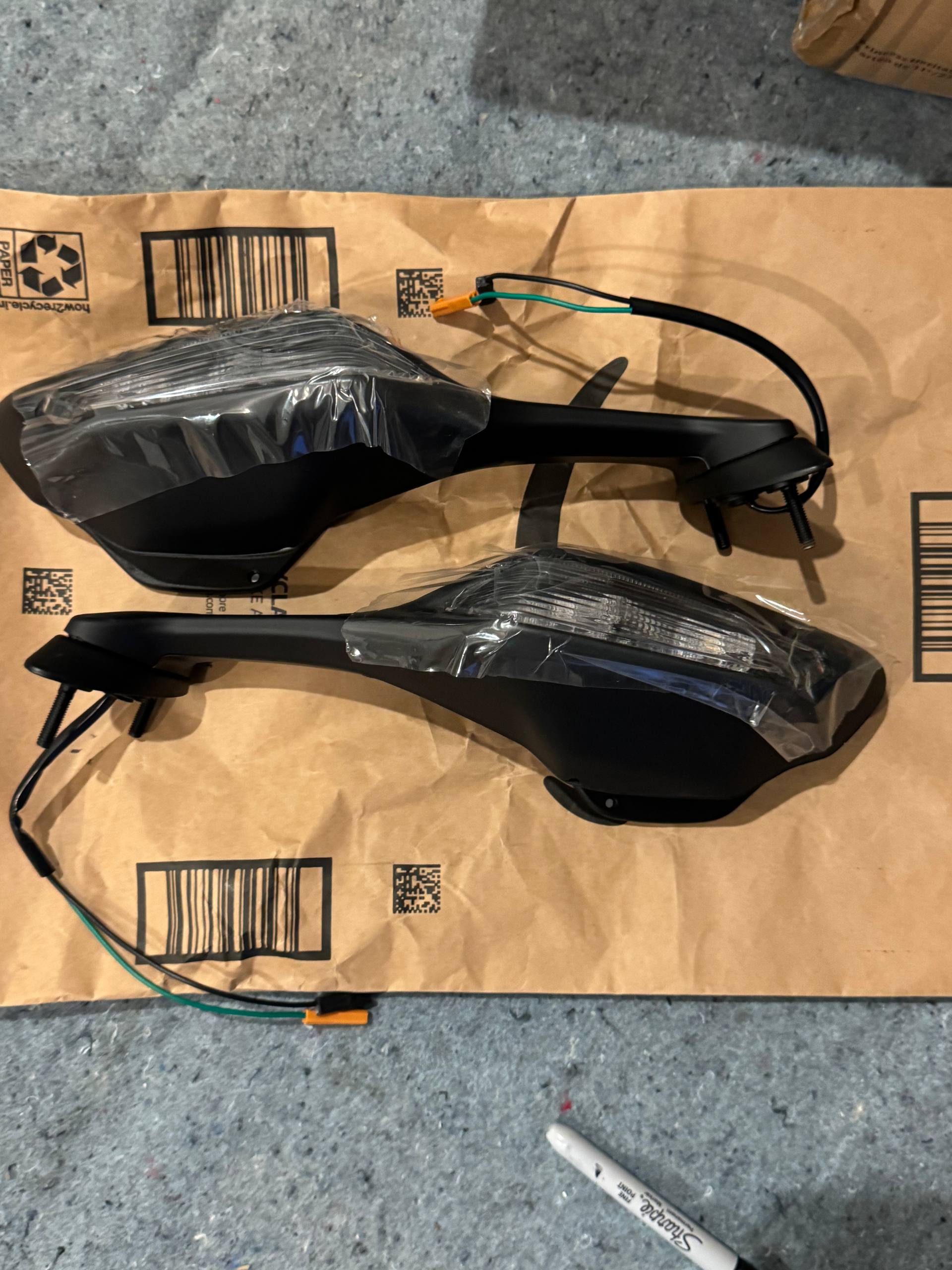 Aftermarket smoked rearview mirrors with integrated LED turn signals for the 2017-2019 Honda CBR1000RR. Black angular housing, smoked lens. Left and right pair included. Wired connectors included for turn signal function. New, uninstalled condition.
