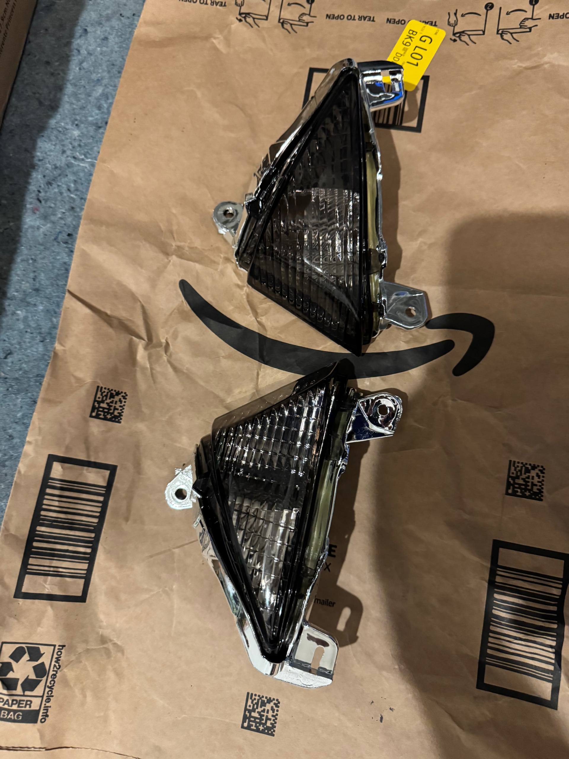 Smoked turn signal indicator pair (left + right) for multiple Kawasaki models. Triangular wedge-shaped smoked lens, chrome/aluminum housing. New, uninstalled. Fits: Kawasaki Ninja 650R / ER-6N 2006-2008, Z1000 2007-2013, ZX-6R 2007-2012, ZZ-R1400 / Ninja ZX-14R. Verify fitment with your specific year before ordering.