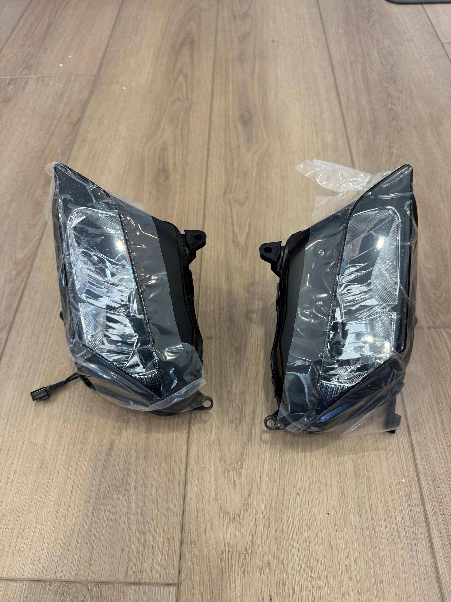 Left and right headlight assemblies for Honda CBR600RR 2007-2012. Black housing with clear lens and chrome reflective internals. Direct OEM-style replacement. Still wrapped in factory protective plastic. New, never installed. Sold as a pair.
