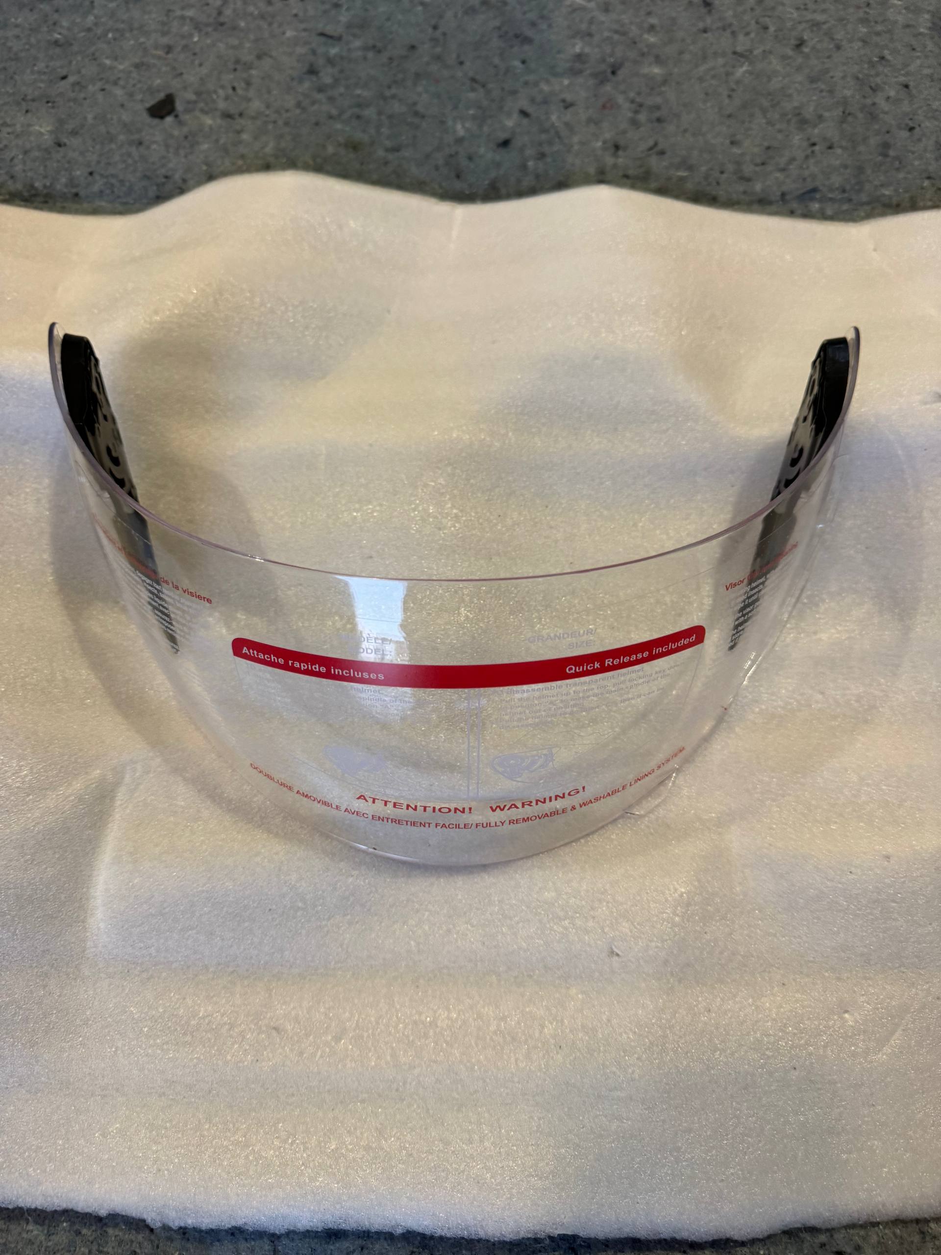 TCMT clear helmet visor/face shield. New with protective film still on. Anti-fog and anti-scratch treatment. Quick-release mechanism included. Fits: TCMT Helmet XF270203, XF27, XF270206, XF270231, and other HY901 full face helmets. Shield only — helmet not included.
