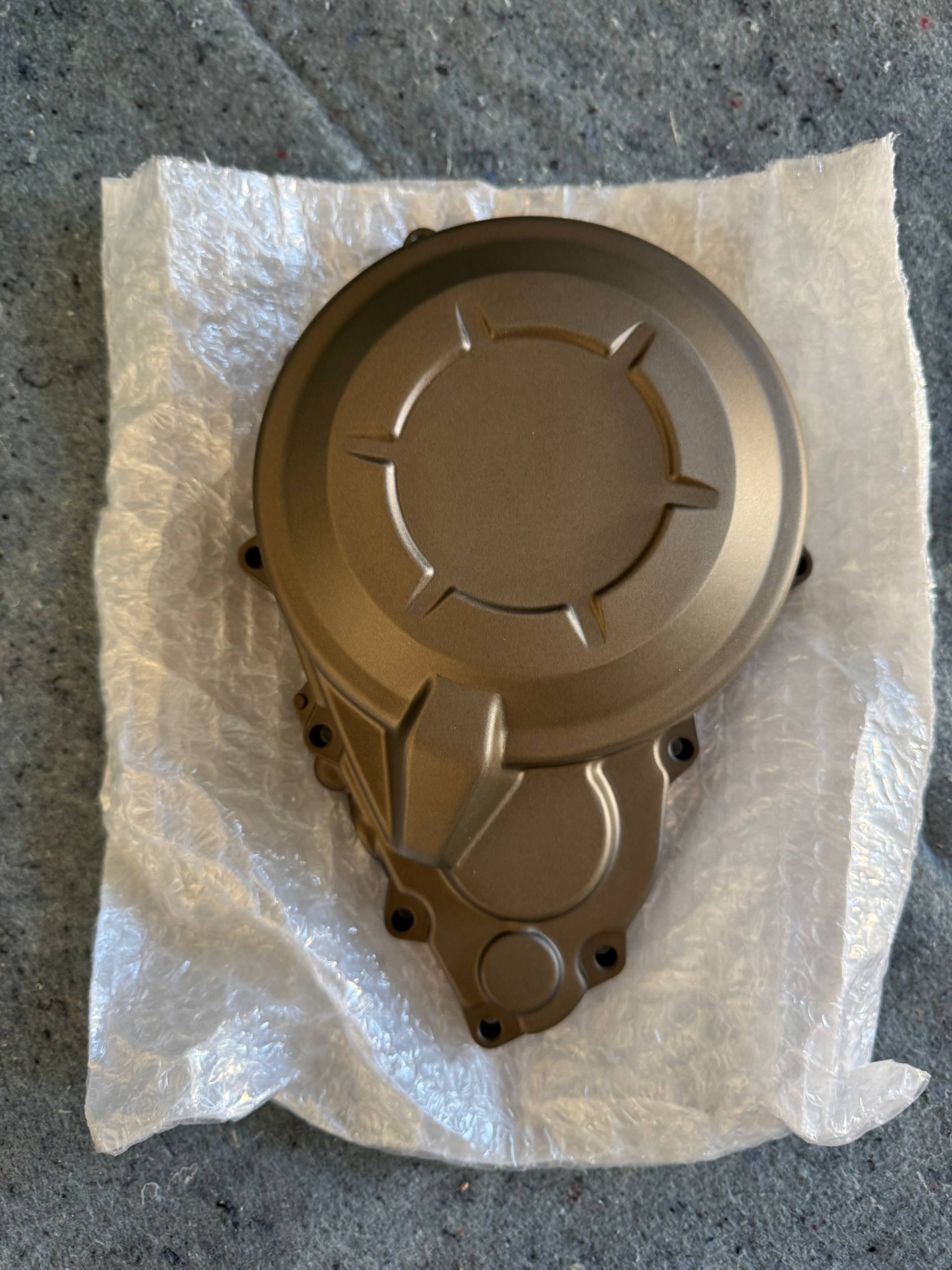 TCMT aftermarket left stator/generator engine cover for the 2016-2018 Honda CB500F and CBR500R. Gold anodized finish with distinctive relief pattern. New, uninstalled. Direct bolt-on replacement. All mounting holes intact.