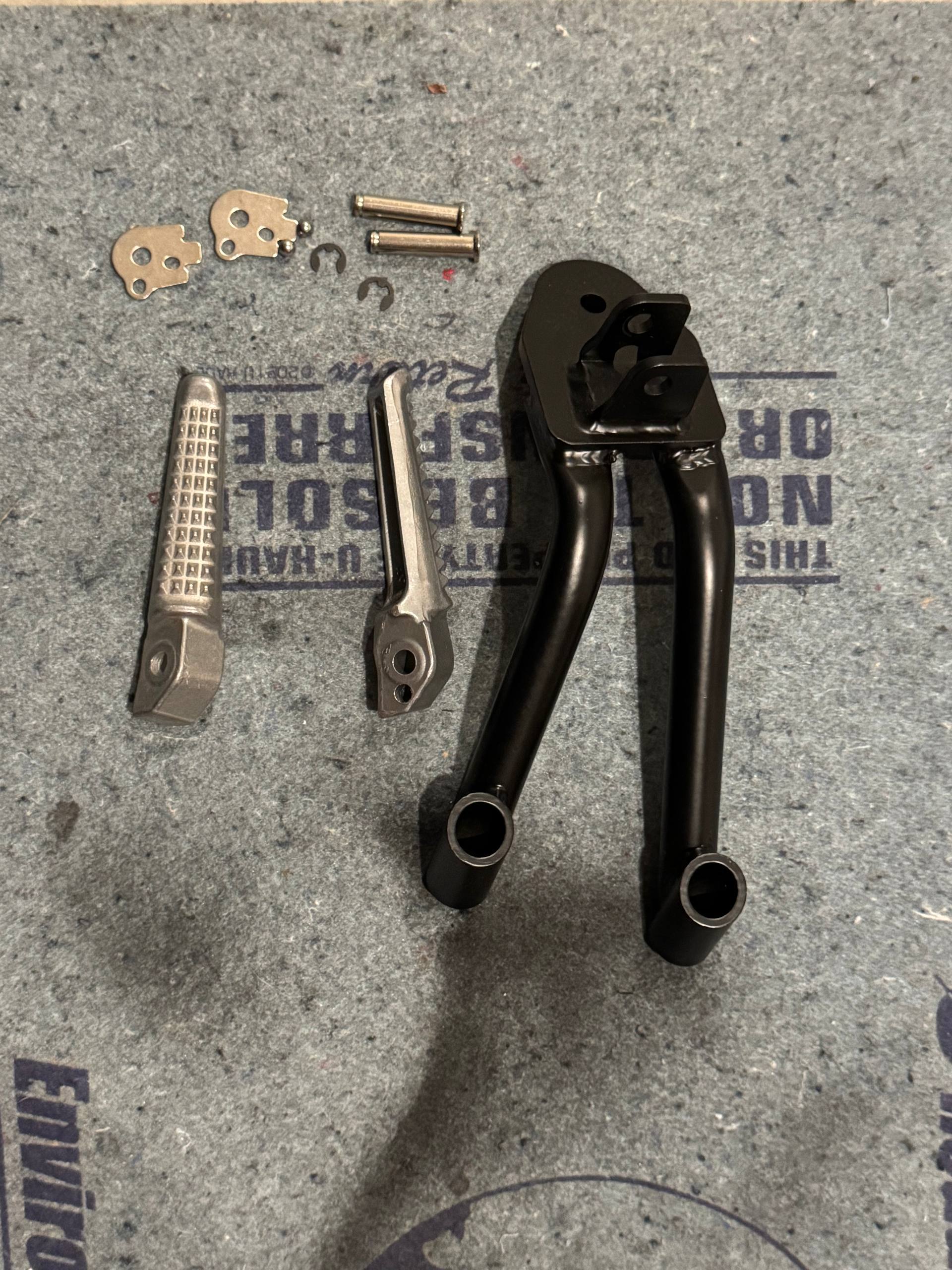 Aftermarket rear passenger footpeg and mounting bracket kit for Honda Rebel CMX500. Includes two black powder-coated mounting arms, two chrome knurled footpegs, pivot pins, E-clips, detent balls, clevis plates, bolts, washers, and nuts. Full hardware kit — everything needed for install. Brand new, unused. Retail .99. Fitment: Honda Rebel CMX500 2017-2025.