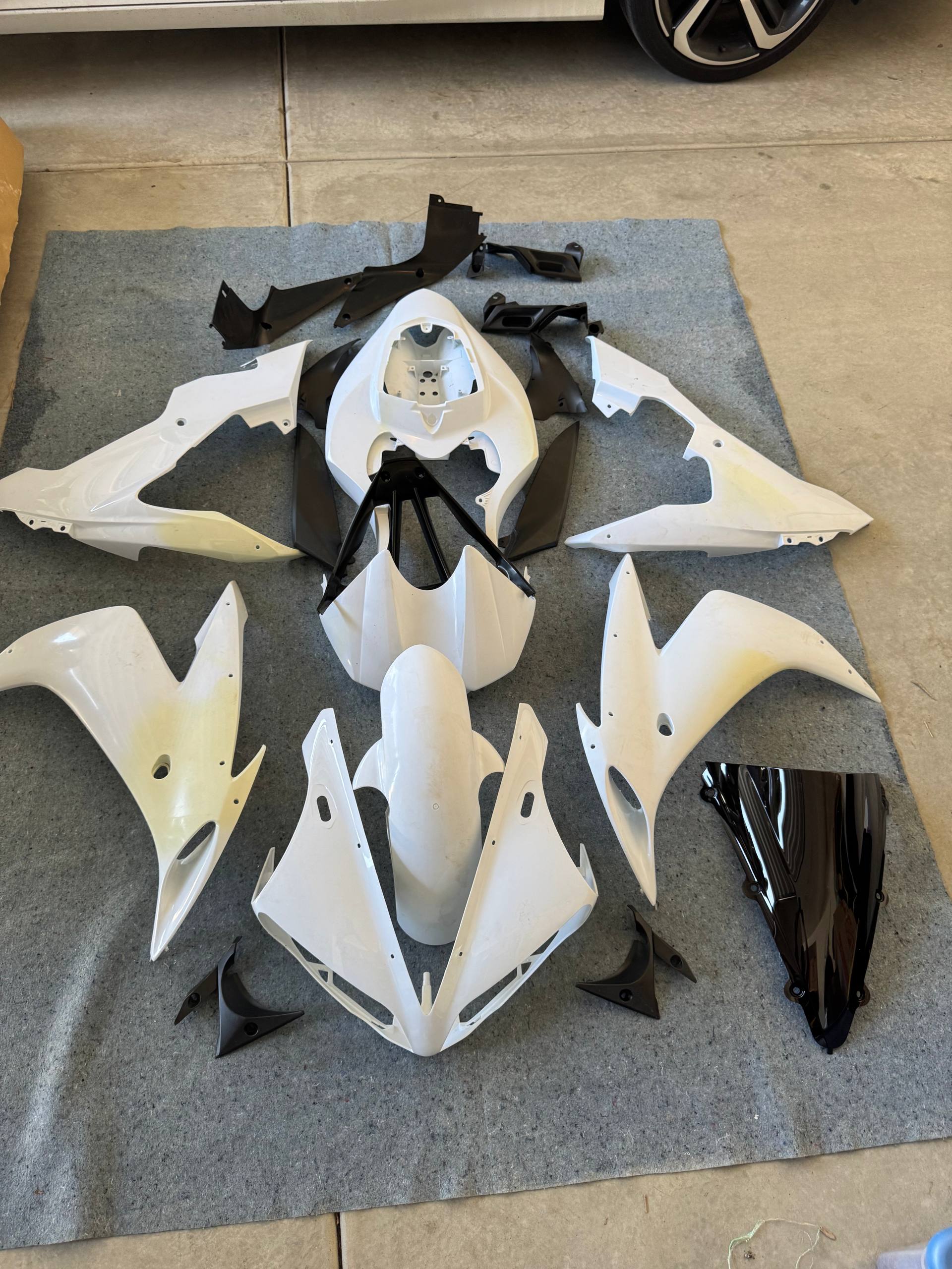 Complete unpainted aftermarket ABS fairing kit for the 2004-2006 Yamaha YZF-R1. Approximately 17 pieces including upper nose cowl, left/right mid fairings with signature wing-style side panels, lower side panels, belly pan, tail section, tank cover, black inner brackets, and a smoked double-bubble windscreen. All pieces new and uninstalled, ready for custom paint. Black inner panels pre-finished. Direct bolt-on fitment.