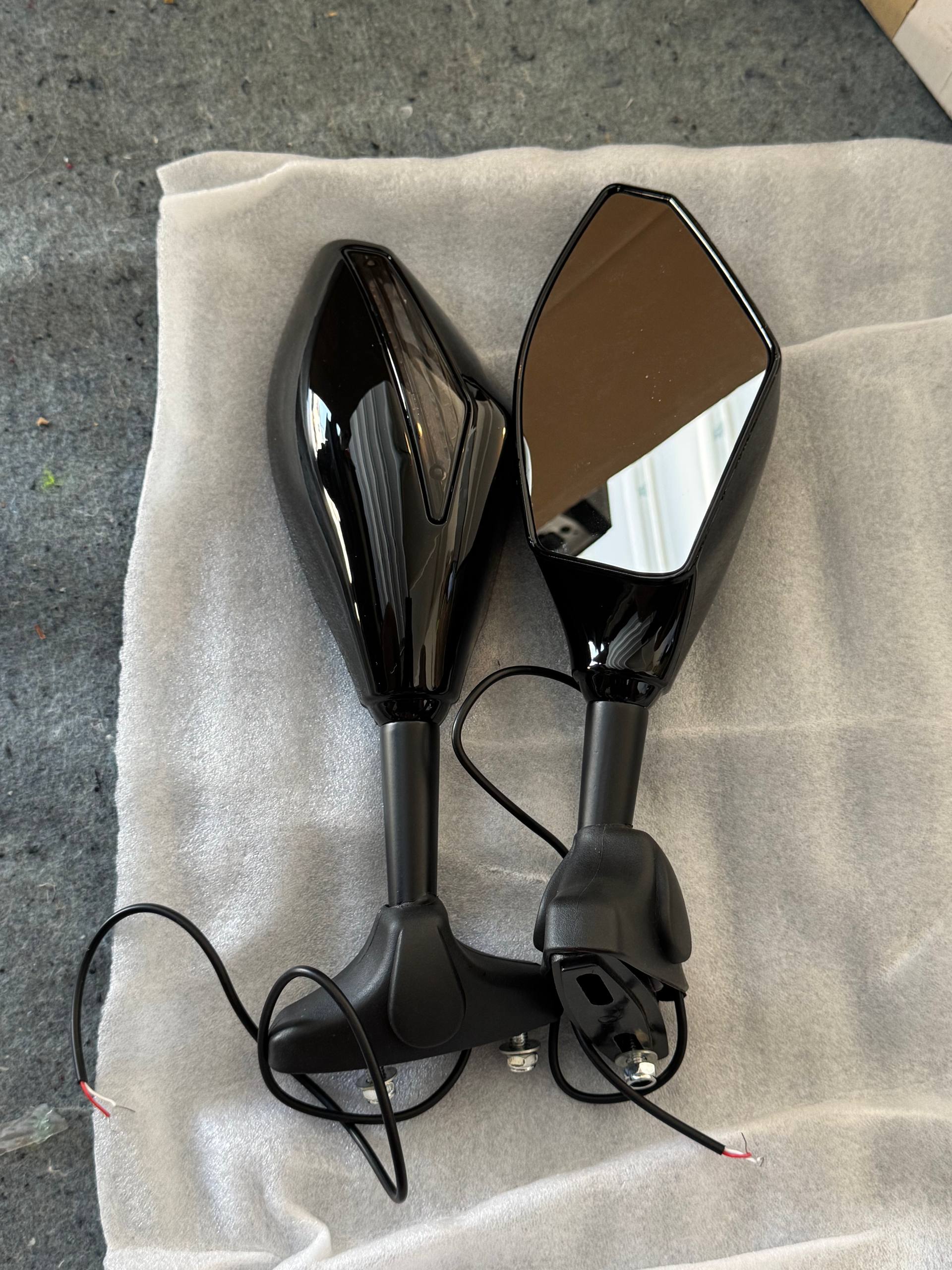 UPTBSFLS 1 pair handlebar rearview mirrors with integrated turn signal lights for Yamaha YZF-R1 and YZF-R6. Wires are cleanly cut and ready to crimp — easy plug-in install. Fitment: Yamaha YZF-R1 2000-2008, YZF-R6 2000-2008, YZF-R6S 2006-2008.