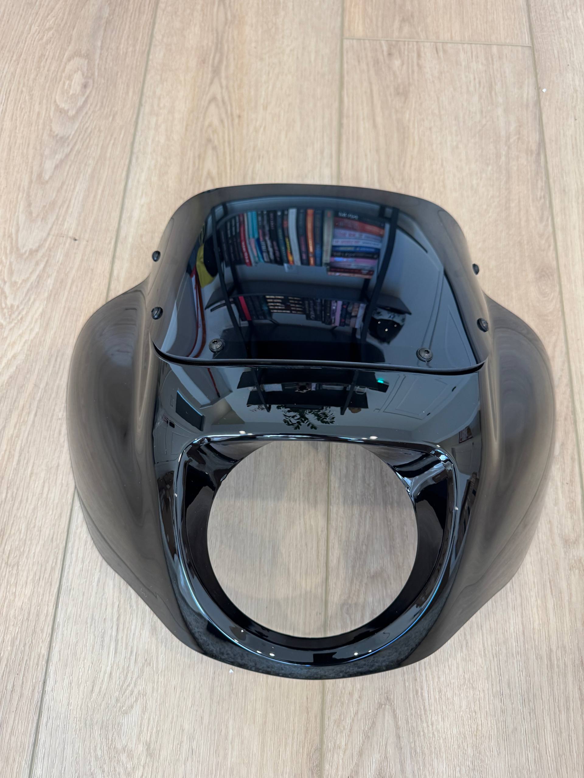 Vivid gloss black bat-wing front fairing shell with integrated tinted windshield and chrome headlight bezel ring. Large round headlight opening with chrome trim ring. Deep gloss black ABS finish with smoked windshield panel. Mounting bolts included. Road King / Street Glide style fairing. New, never installed. Show-quality finish with zero scratches.