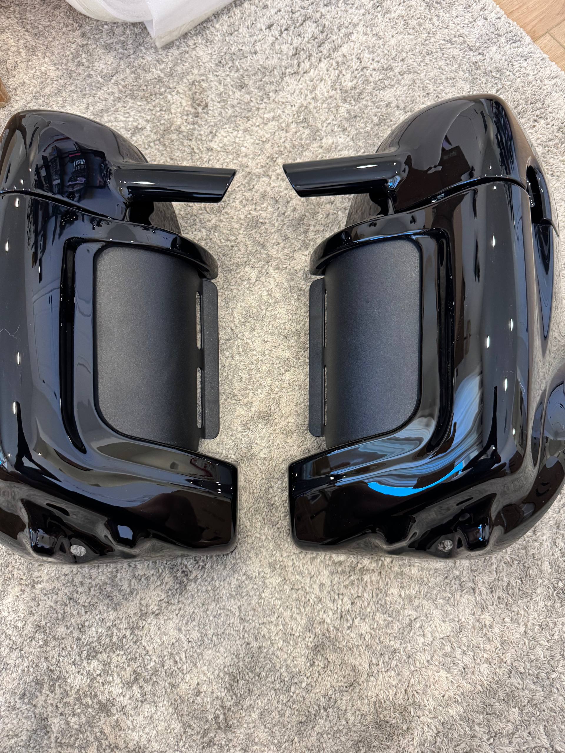 Vivid black lower vented leg fairings for Harley-Davidson Touring models. Left and right pair with speaker cutouts and mesh grille inserts. High-gloss vivid black ABS finish. Interior mounting brackets and hardware included. These bolt onto the engine guard / crash bars and provide wind and weather protection for legs. New, never installed.