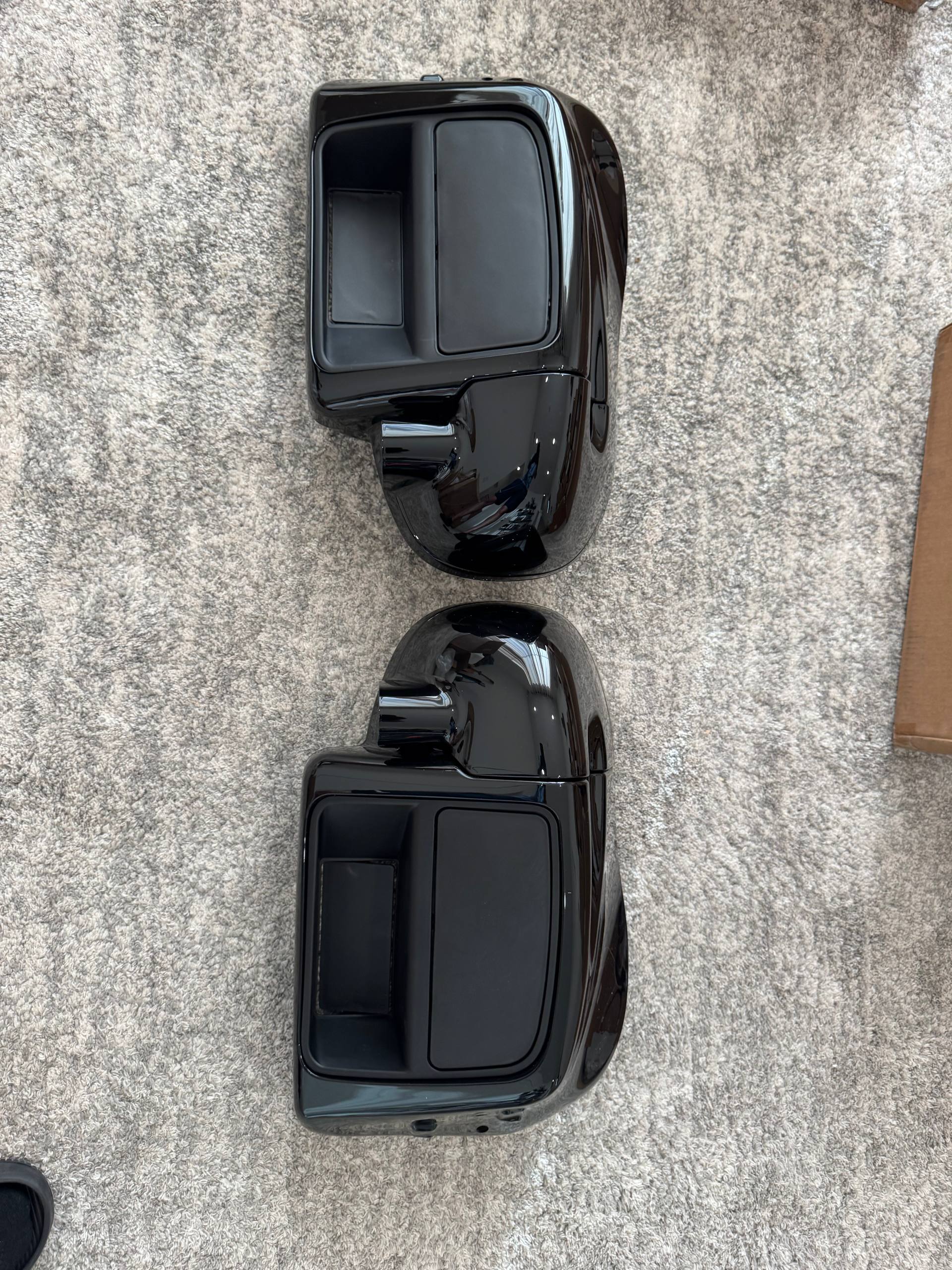 XFMT vivid black lower vented leg fairings with built-in 6.5-inch speaker box pods — left and right pair. Gloss black ABS with smooth finish. Speaker pod opening pre-cut and ready for 6.5" speaker installation. Mounting hardware tabs included. New, unused. Fits air-cooled Touring models 2014-2023.